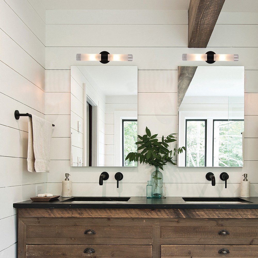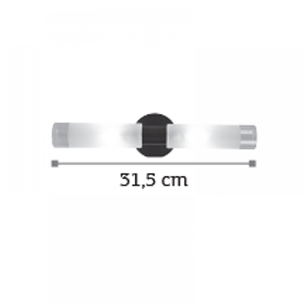 Πρόκειται για ένα επιτοίχιο φωτιστικό κατασκευασμένο από μέταλλο σε μαύρη απόχρωση με δύο λαμπτήρες που καλύπτονται από κυλινδρικό γυαλί αμμοβολής με διάφανες λεπτομέρειες. Είναι η ιδανική επιλογή για φωτισμό μπάνιου τοποθετημένο πάνω από τον καθρέπτη αφού το φως διαχέεται ομοιόμορφα.