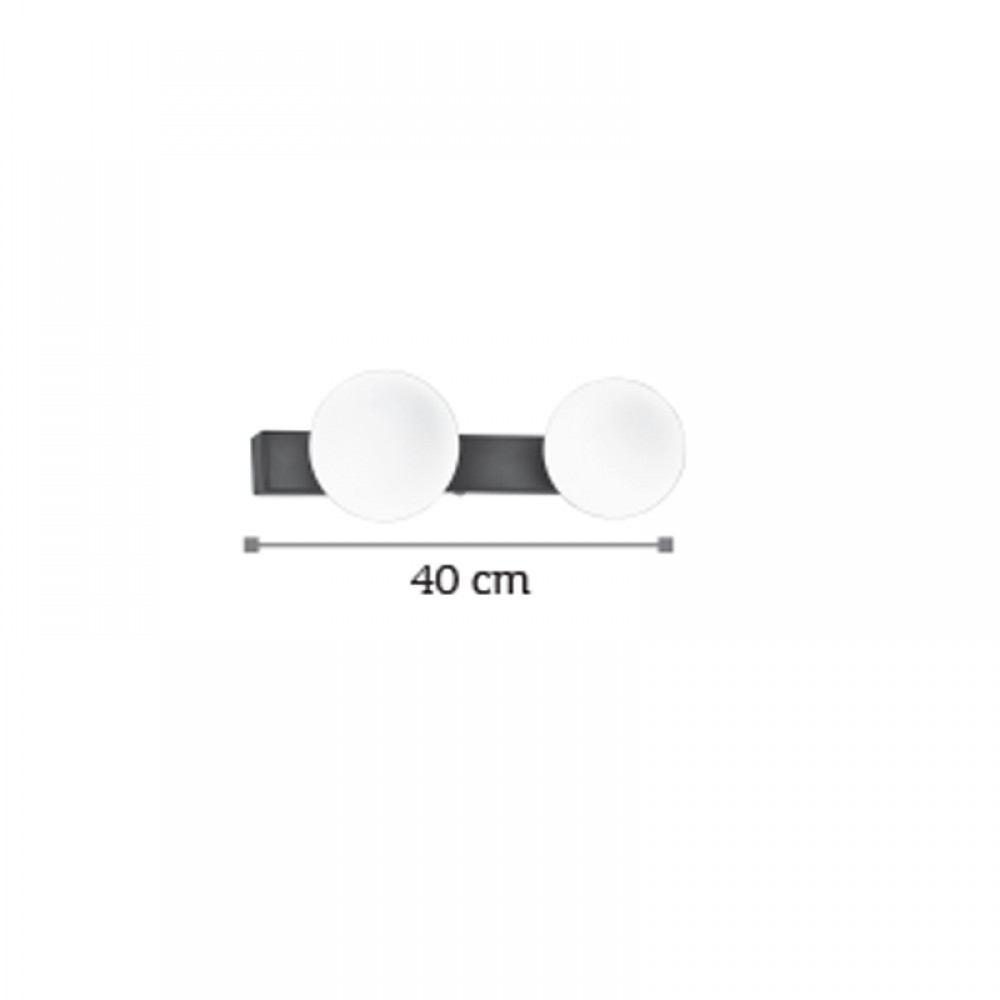 Πρόκειται για ένα επιτοίχιο φωτιστικό από μαύρο μέταλλο λευκή οπαλίνα και δύο λαμπτήρες. Η μίνιμαλ σχεδίαση και το σχήμα του το τοποθετεί σε μοντέρνους χώρους εσωτερικής διακόσμησης. Τοποθετείται και ως φωτιστικό οροφής!