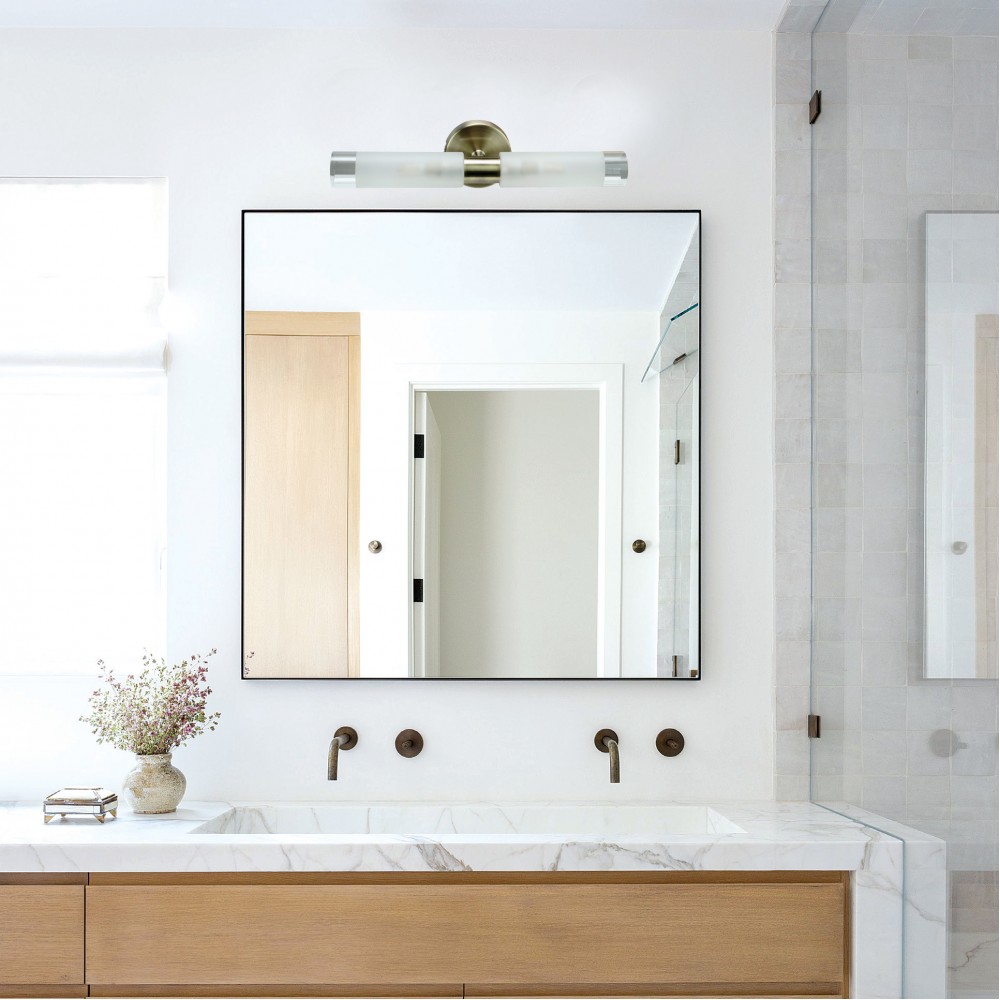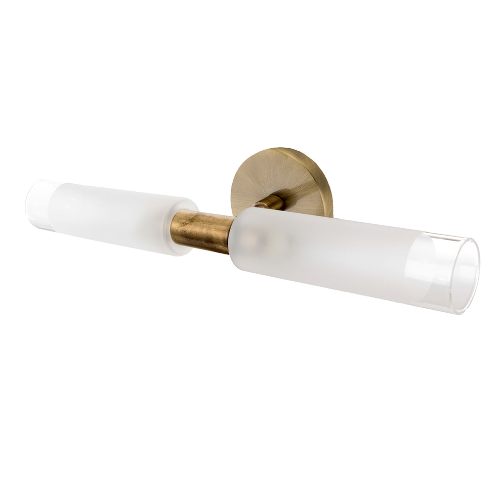 Πρόκειται για ένα επιτοίχιο φωτιστικό κατασκευασμένο από μέταλλο σε οξυντέ απόχρωση με δύο λαμπτήρες που καλύπτονται από κυλινδρικό γυαλί αμμοβολής με διάφανες λεπτομέρειες. Είναι η ιδανική επιλογή για φωτισμό μπάνιου τοποθετημένο πάνω από τον καθρέπτη αφού το φως διαχέεται ομοιόμορφα.