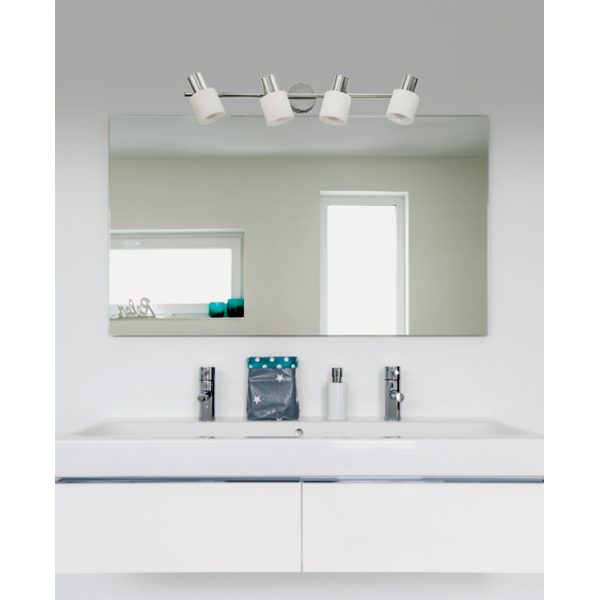 Πρόκειται για ένα μεταλλικό σποτ σε απόχρωση λευκής πατίνας με τέσσερις λαμπτήρες. Το λευκό γυαλί επιτρέπει στο φως να διαχέεται ομοιόμορφα στον χώρο. Το μπροστινό μέρος του κινείται προς οποιαδήποτε κατεύθυνση.