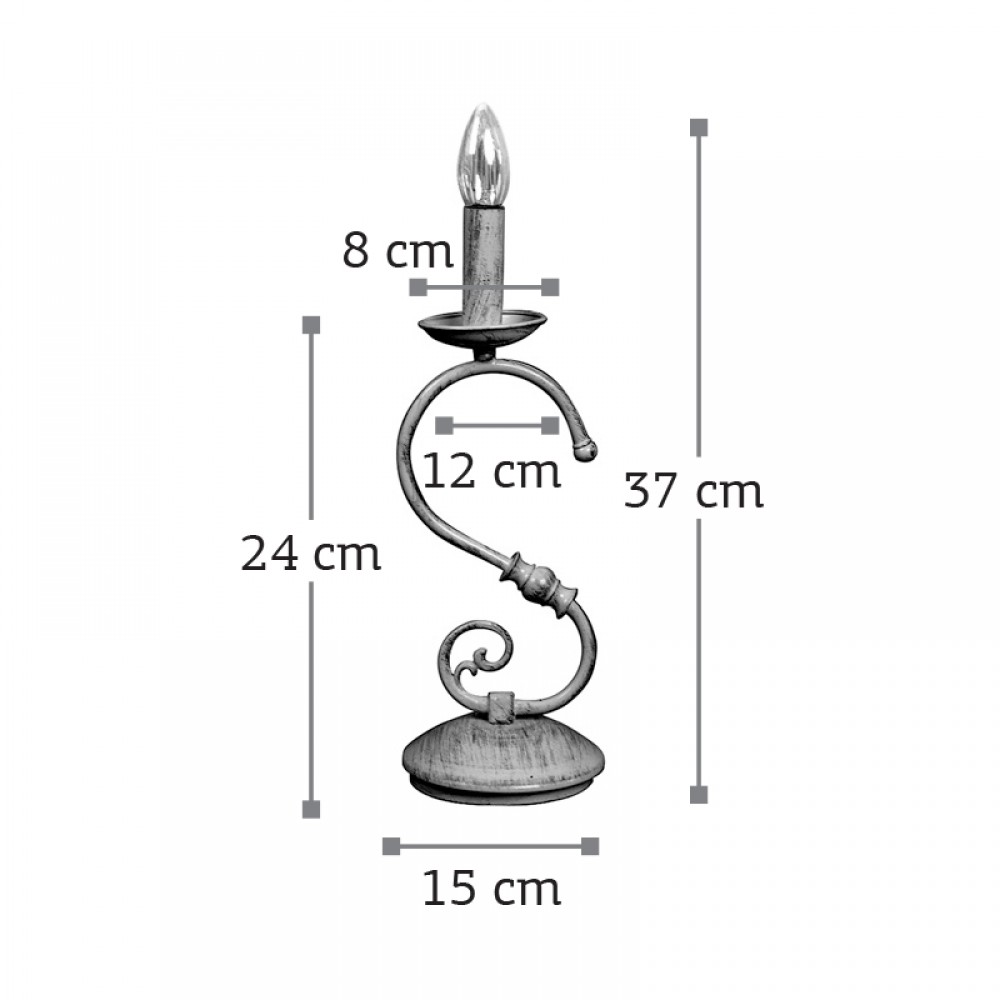 Πρόκειται για ένα επιτραπέζιο φωτιστικό από μέταλλο σε λευκή πατίνα. Κατάλληλο για διακόσμηση κλασσικών εσωτερικών χώρων. Διατίθεται και λευκό υφασμάτινο καπέλο για πιο απαλό φωτισμό το οποίο θα πρέπει να ζητηθεί επιπλέον.