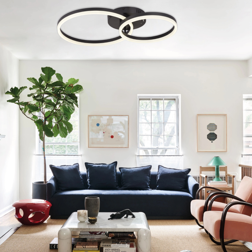 Φωτιστικό οροφής LED 45W σε μαύρη απόχρωση με επιλογή απόχρωσης φωτισμού απο διακόπτη που βρίσκεται στην βάση του φωτιστικού (3CCT by switch on base) .Το προϊόν ντιμάρεται απο απλό διακόπτη τοίχου με εναλλαγή στο πάτημα (3 step dimmable)