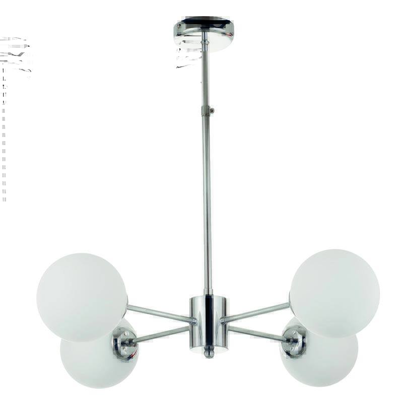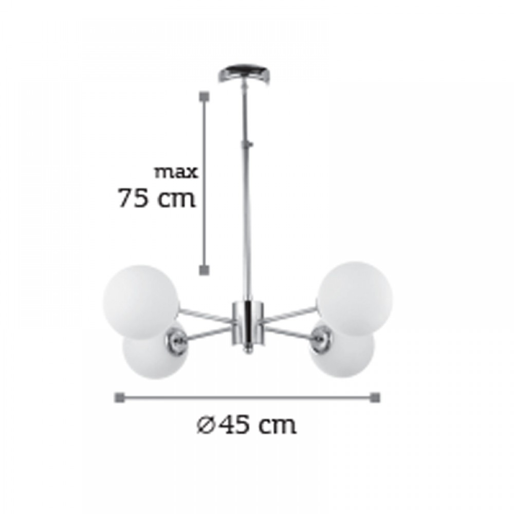Πρόκειται για ένα χρώμιο μεταλλικό φωτιστικό με λευκή οπαλίνα στο τελείωμα και τέσσερις λαμπτήρες. Η μίνιμαλ σχεδίασή του το τοποθετεί ιδανικά σε οποιονδήποτε μοντέρνο εσωτερικό χώρο. Η ανάρτησή του είναι μεταλλική και ρυθμιζόμενη ώστε να προσαρμοστεί ιδανικά στον χώρο τοποθέτησής του.