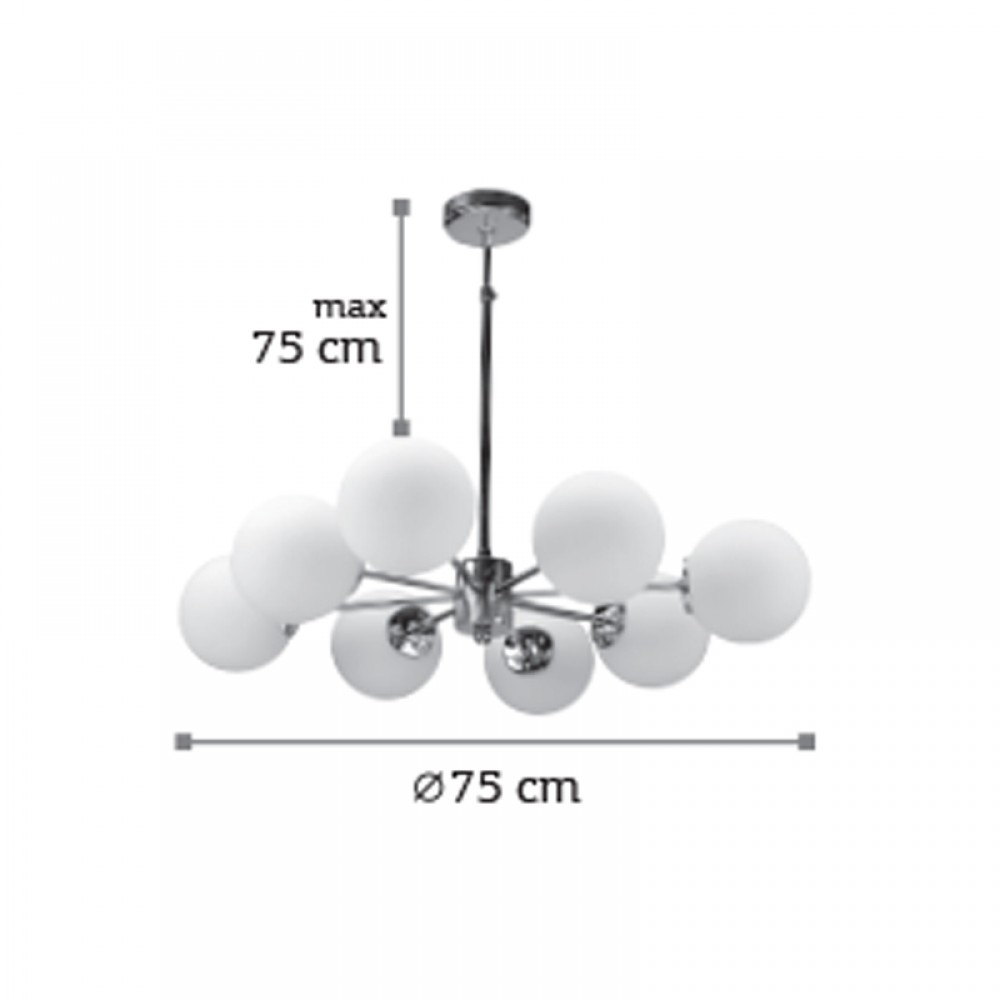 Πρόκειται για ένα χρώμιο μεταλλικό φωτιστικό με λευκή οπαλίνα στο τελείωμα και οχτώ λαμπτήρες. Η μίνιμαλ σχεδίασή του το τοποθετεί ιδανικά σε οποιονδήποτε μοντέρνο εσωτερικό χώρο. Η ανάρτησή του είναι μεταλλική και ρυθμιζόμενη ώστε να προσαρμοστεί ιδανικά στον χώρο τοποθέτησής του.