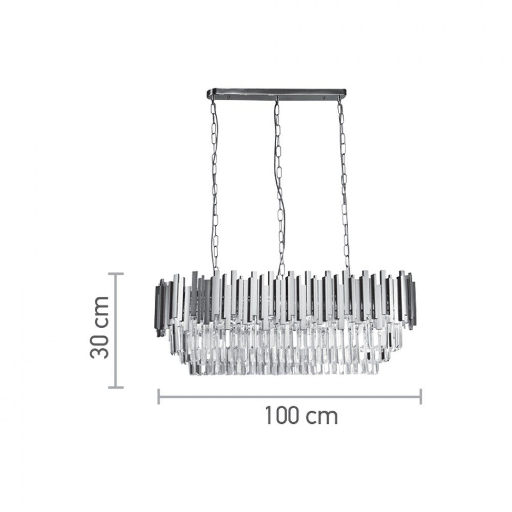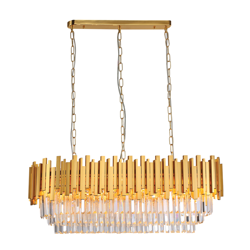 Πρόκειται για ένα οβάλ κρεμαστό φωτιστικό κατασκευασμένο από χρυσαφί αλουμίνιο. Η ιδιαίτερή του σχεδίαση συμπληρώνεται από τα κρύσταλλα, καθιστώντας το εντυπωσιακό.