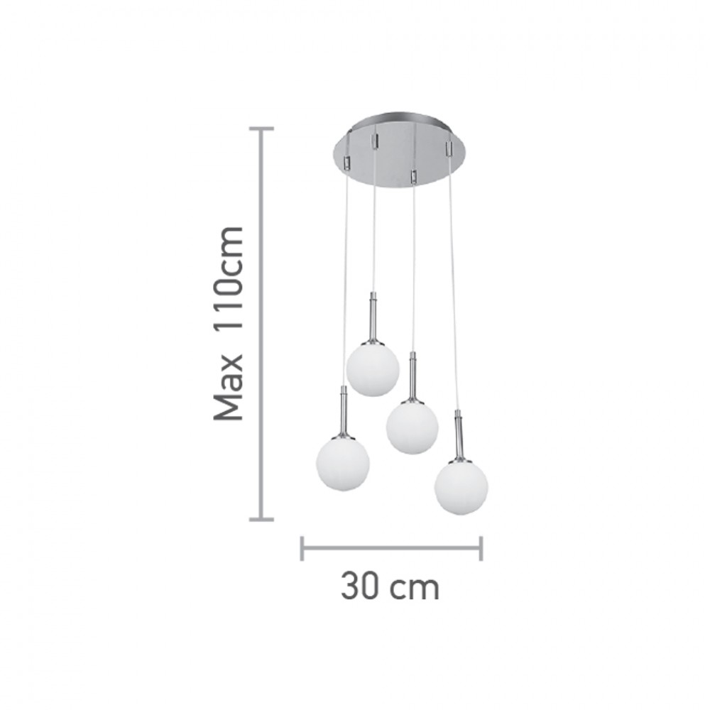 Πρόκειται για ένα χρυσαφί μεταλλικό φωτιστικό με λευκή οπαλίνα και τέσσερις λαμπτήρες. Το ύψος μπορεί να ρυθμιστεί ώστε να προσαρμοστεί στον μοντέρνο χώρο τοποθέτησής του.