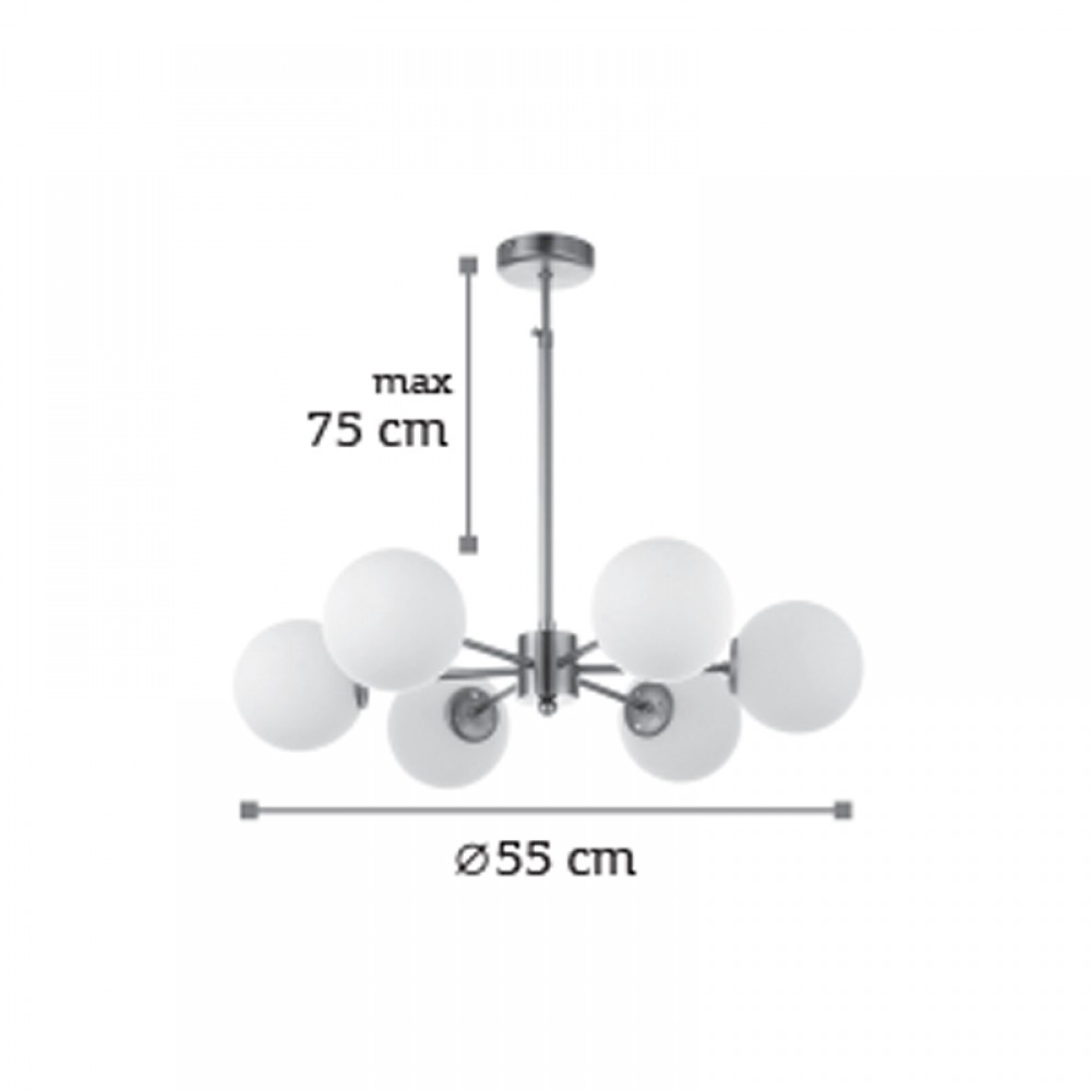 Πρόκειται για ένα χρυσό ματ μεταλλικό φωτιστικό με λευκή οπαλίνα στο τελείωμα και έξι λαμπτήρες. Η μίνιμαλ σχεδίασή του το τοποθετεί ιδανικά σε οποιονδήποτε μοντέρνο αλλά και πιο κλασσικό εσωτερικό χώρο. Η ανάρτησή του είναι μεταλλική και ρυθμιζόμενη ώστε να προσαρμοστεί ιδανικά στον χώρο τοποθέτησής του.