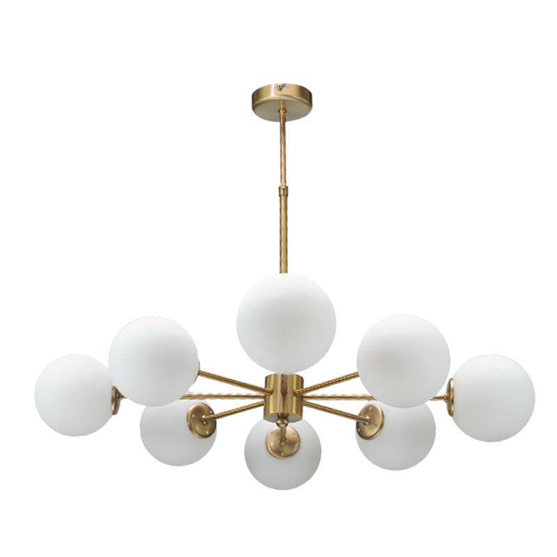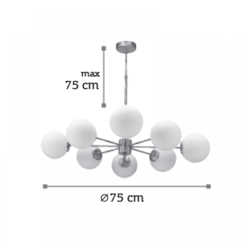 Πρόκειται για ένα χρυσό ματ μεταλλικό φωτιστικό με λευκή οπαλίνα στο τελείωμα και οκτώ λαμπτήρες. Η μίνιμαλ σχεδίασή του το τοποθετεί ιδανικά σε οποιονδήποτε μοντέρνο αλλά και πιο κλασσικό εσωτερικό χώρο. Η ανάρτησή του είναι μεταλλική και ρυθμιζόμενη ώστε να προσαρμοστεί ιδανικά στον χώρο τοποθέτησής του.