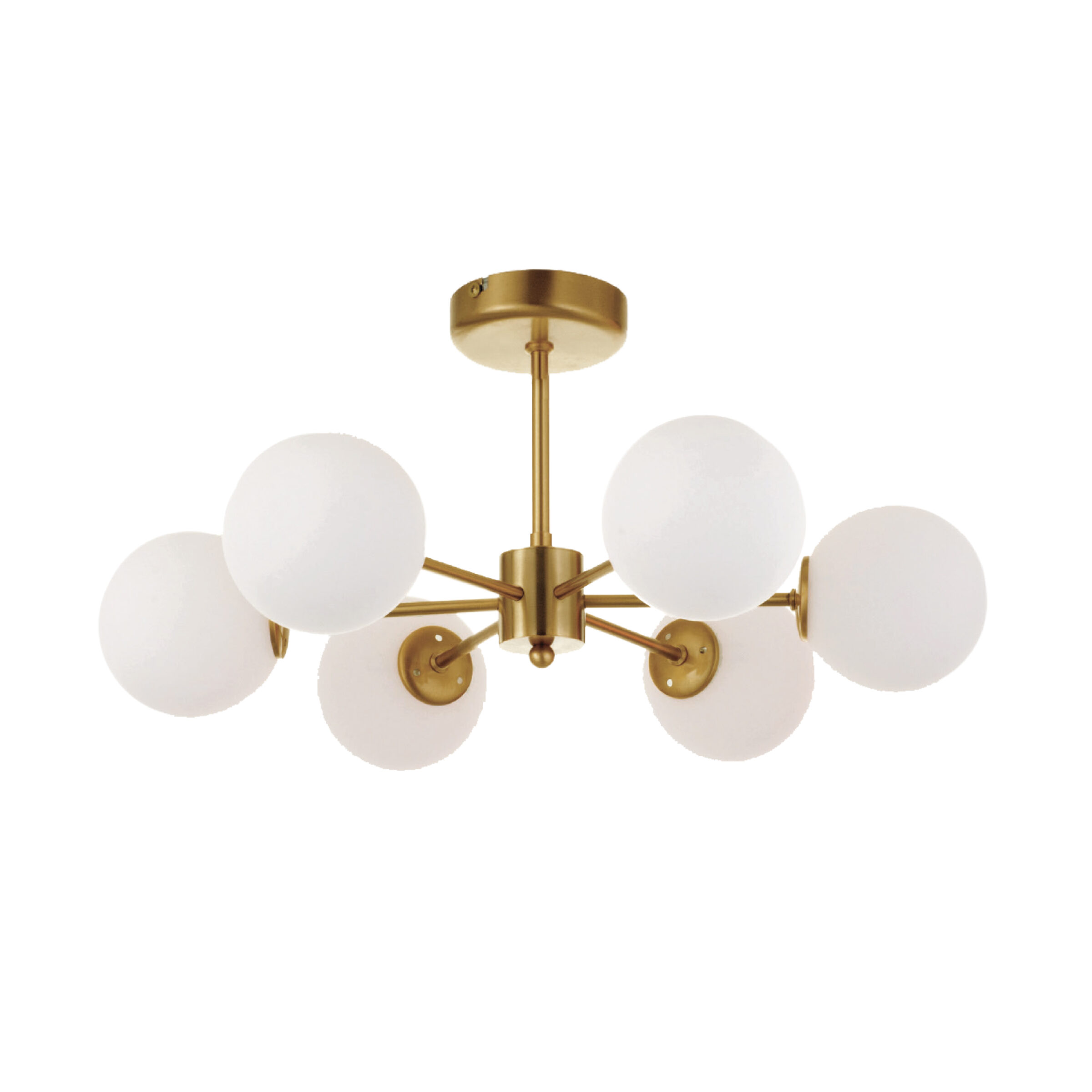 Πρόκειται για ένα χρυσό ματ μεταλλικό φωτιστικό με λευκή οπαλίνα στο τελείωμα και έξι λαμπτήρες. Η μίνιμαλ σχεδίασή του το τοποθετεί ιδανικά σε οποιονδήποτε μοντέρνο αλλά και πιο κλασσικό εσωτερικό χώρο.