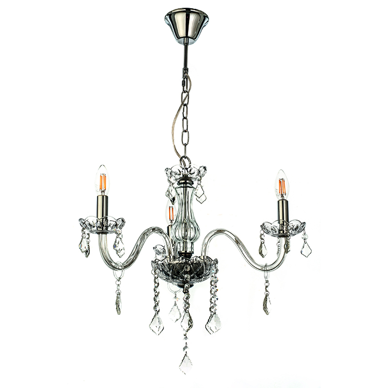 Πρόκειται για ένα διάφανο γυάλινο κρεμαστό φωτιστικό με τρεις λαμπτήρες. Τόσο τα διάφανα κρύσταλλα που κρέμονται όσο και οι χρώμιο μεταλλικές λεπτομέρειες του προσδίδουν μια επιπλέον λάμψη. Η χρώμιο μεταλλική ανάρτηση είναι ρυθμιζόμενη και προσαρμόζεται στον κάθε χώρο.