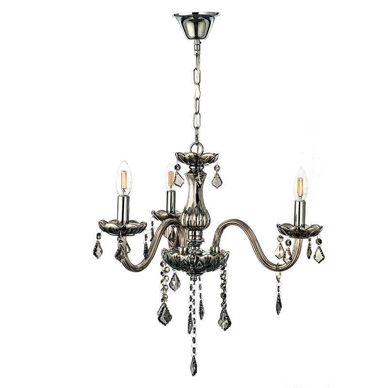 Πρόκειται για ένα φιμέ γυάλινο κρεμαστό φωτιστικό με τρεις λαμπτήρες. Τόσο τα φιμέ κρύσταλλα που κρέμονται όσο και οι χρώμιο μεταλλικές λεπτομέρειες του προσδίδουν μια επιπλέον λάμψη. Η χρώμιο μεταλλική ανάρτηση είναι ρυθμιζόμενη και προσαρμόζεται στον κάθε χώρο.