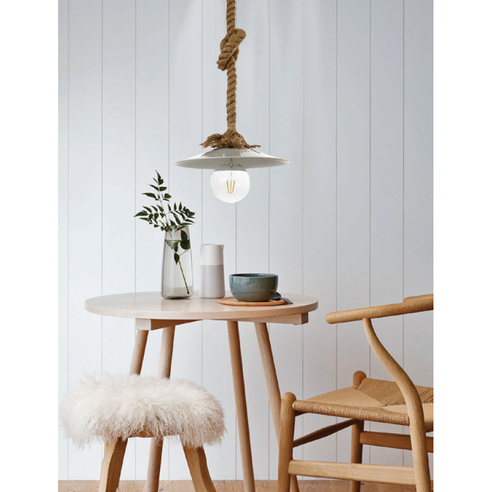 Πρόκειται για ένα κρεμαστό φωτιστικό με συνδυασμό καφέ σχοινιού και λευκού μετάλλου. Η ανάρτηση από σχοινί μπορεί να ρυθμιστεί για να προσαρμοστεί στον κάθε χώρο.