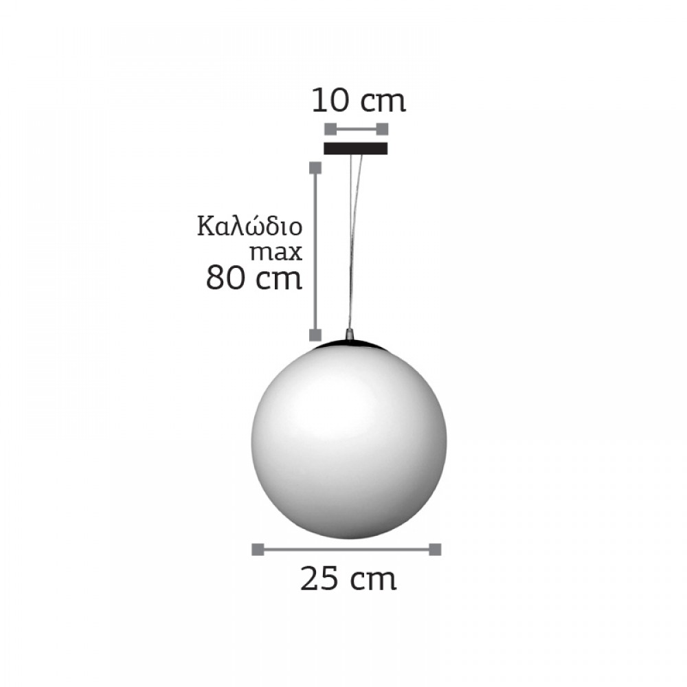 Πρόκειται για ένα κρεμαστό φωτιστικό κατασκευασμένο από λευκή οπαλίνα σε σχήμα σφαιρικό. Η διάστασή του του επιτρέπει να τοποθετηθεί σε ποικίλους εσωτερικούς χώρους. Η ανάρτησή του καθιστά εύκολη την προσαρμογή του σε κάθε χώρο.