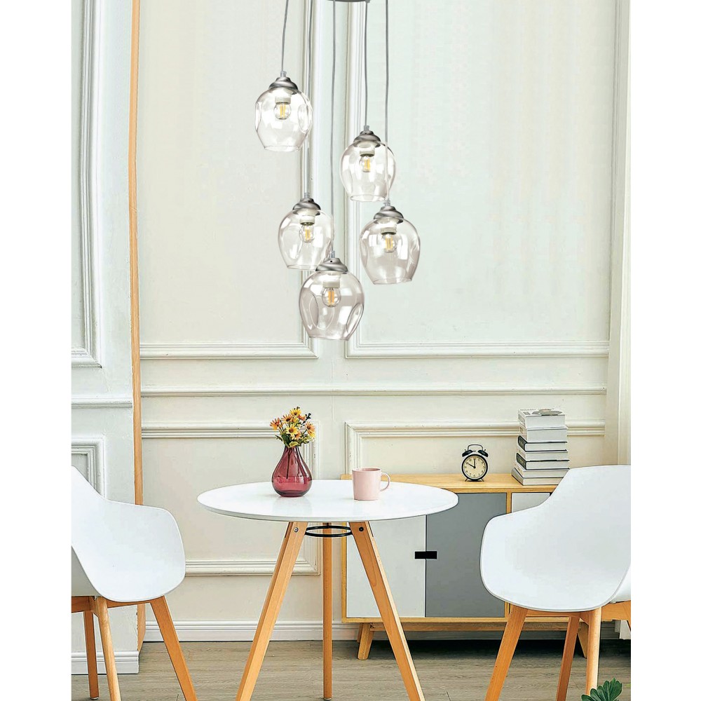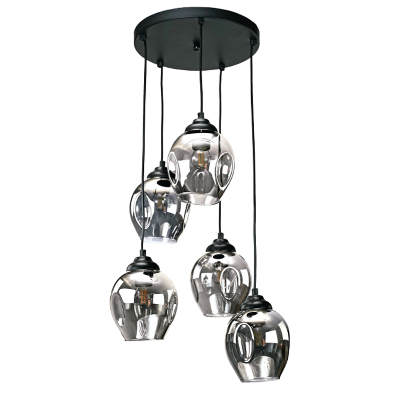 Πρόκειται για ένα κρεμαστό φωτιστικό από μαύρο μέταλλο και φιμέ γυαλί με πέντε λαμπτήρες. Διατίθεται και η επιλογή του διάφανου γυαλιού. Το ύψος της ανάρτησης ρυθμίζεται στον κάθε μοντέρνο εσωτερικό χώρο τοποθέτησης του.