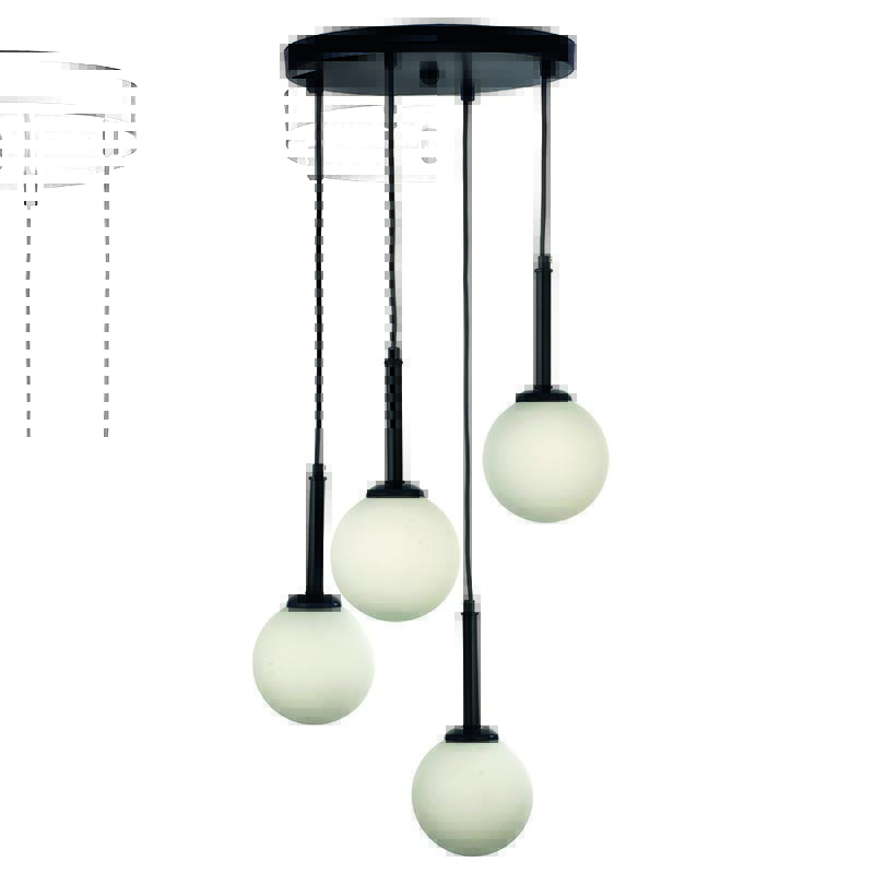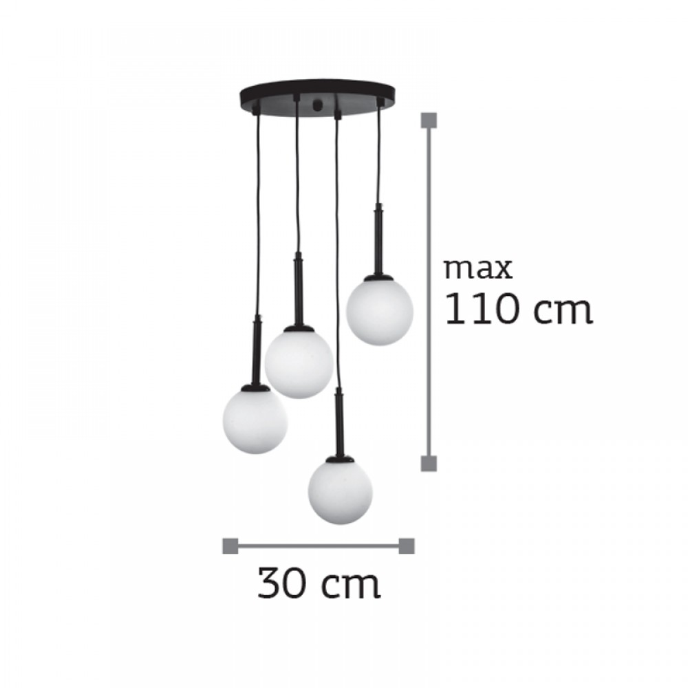 Πρόκειται για ένα μαύρο μεταλλικό φωτιστικό με λευκή οπαλίνα και τέσσερις λαμπτήρες. Το ύψος μπορεί να ρυθμιστεί ώστε να προσαρμοστεί στον μοντέρνο χώρο τοποθέτησής του.