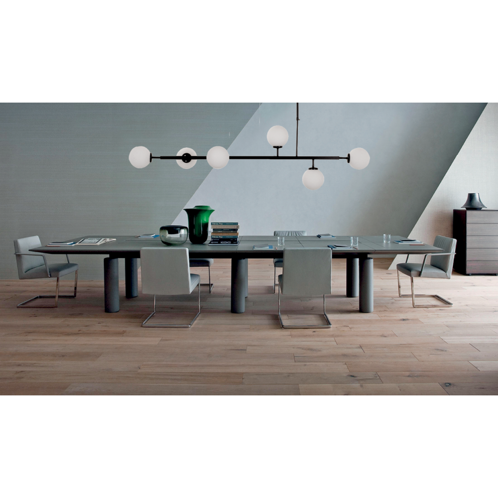 Πρόκειται για ένα μαύρο μεταλλικό κρεμαστό φωτιστικό με λευκή οπαλίνα και έξι λαμπτήρες. Τοποθετείται ιδανικά πάνω από τετράγωνα και ορθογώνια τραπέζια, ώστε να επιτευχθεί ομοιομορφία. Η ανάρτησή του δίνει τη δυνατότητα να προσαρμοστεί στον μοντέρνο χώρο τοποθέτησή του.