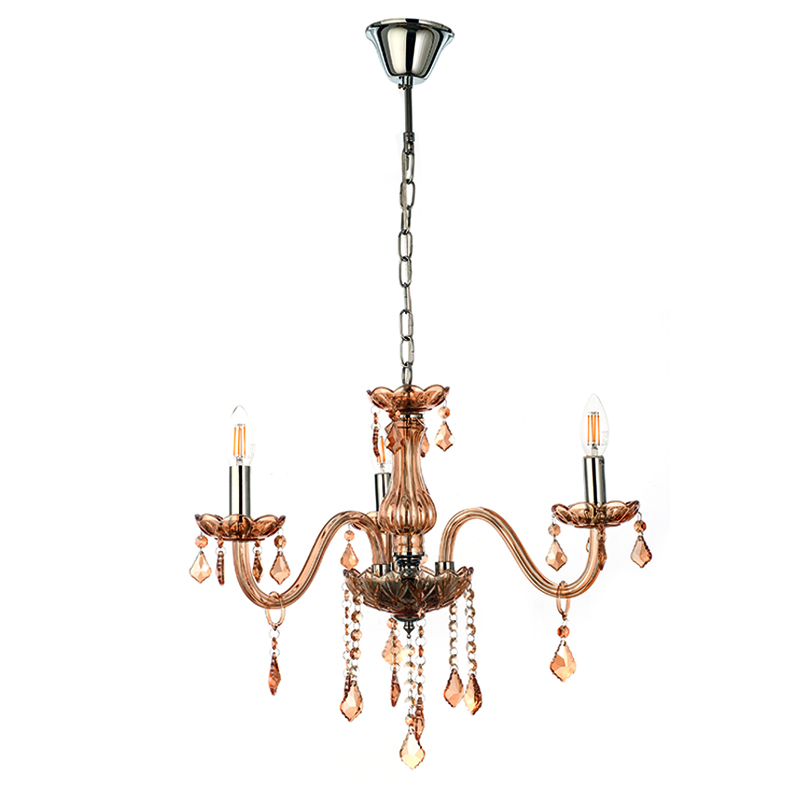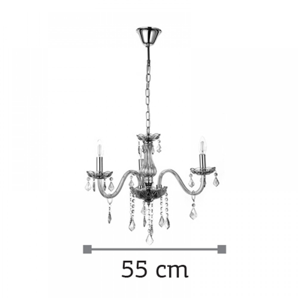 Πρόκειται για ένα μελί γυάλινο κρεμαστό φωτιστικό με τρεις λαμπτήρες. Τόσο τα μελί κρύσταλλα που κρέμονται όσο και οι χρώμιο μεταλλικές λεπτομέρειες του προσδίδουν μια επιπλέον λάμψη. Η χρώμιο μεταλλική ανάρτηση είναι ρυθμιζόμενη και προσαρμόζεται στον κάθε χώρο.