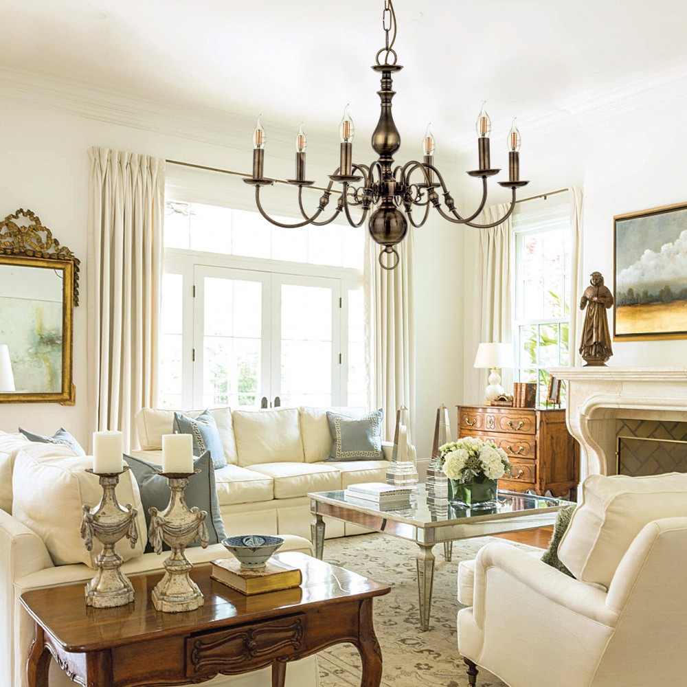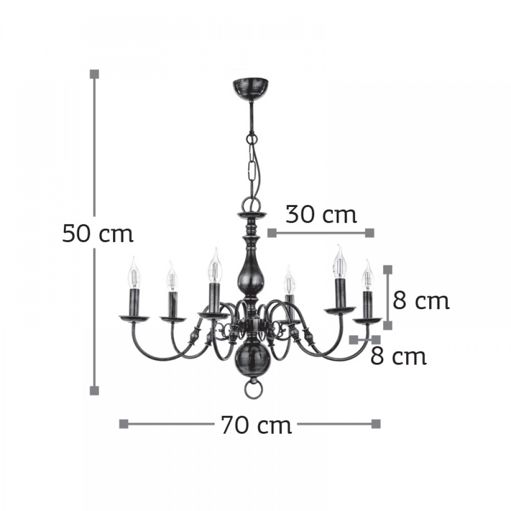 Πρόκειται για ένα κρεμαστό φωτιστικό από οξυντέ μέταλλο με έξι λαμπτήρες. Κατάλληλο για διακόσμηση κλασσικών εσωτερικών χώρων. Η μεταλλική ανάρτηση είναι ρυθμιζόμενη για να προσαρμοστεί στον κάθε χώρο. Διατίθεται και λευκό υφασμάτινο καπέλο για πιο απαλό φωτισμό το οποίο θα πρέπει να ζητηθεί επιπλέον.