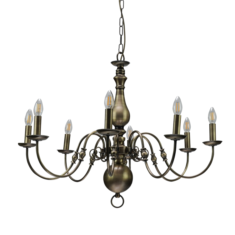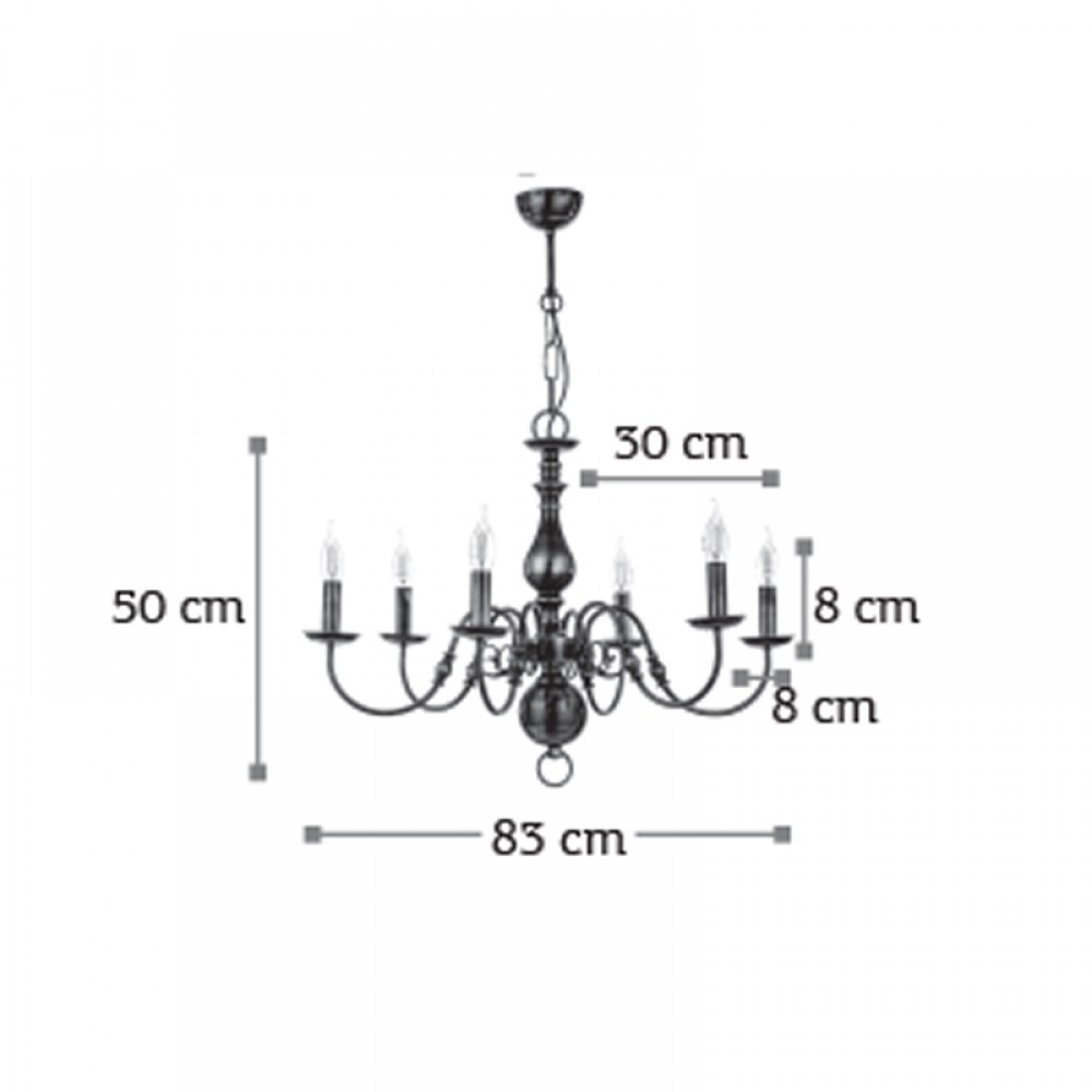 Πρόκειται για ένα κρεμαστό φωτιστικό από οξυντέ μέταλλο με οχτώ λαμπτήρες. Κατάλληλο για διακόσμηση κλασσικών εσωτερικών χώρων. Η μεταλλική ανάρτηση είναι ρυθμιζόμενη για να προσαρμοστεί στον κάθε χώρο. Διατίθεται και λευκό υφασμάτινο καπέλο για πιο απαλό φωτισμό το οποίο θα πρέπει να ζητηθεί επιπλέον.