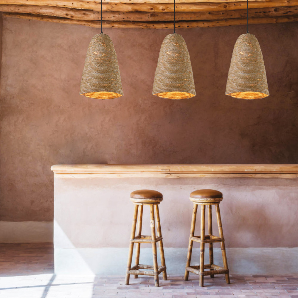 Ένα κρεμαστό φωτιστικό κατασκευασμένο από καφέ σχοινί κατάλληλο για ποικίλους εσωτερικούς χώρους. Αποτελεί την ιδανική επιλογή για όποιον επιθυμεί μια πιο χαλαρή διάθεση στον χώρο του.