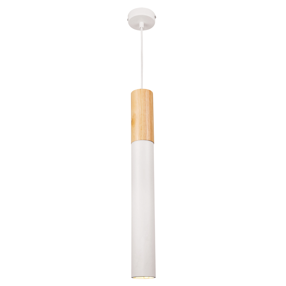 Πρόκειται για ένα κρεμαστό φωτιστικό που συνδυάζει το λευκό μέταλλο και το ξύλο. Έχει μίνιμαλ αισθητική και το ύψος του είναι ρυθμιζόμενο.