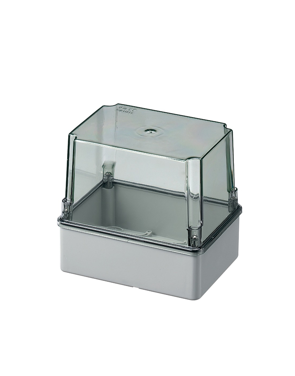 Κουτί διακλάδωσης με ψηλό διάφανο καπάκι σε γκρι χρώμα από ABS. Ο βαθμός στεγανότητας είναι IP56. Η στερέωση γίνεται με βίδα εσωτερικά του κουτιού. Διαθέτει εσωτερικό οδηγό για τη στερέωση της ράγας. Διαθέτει προστασία UV.