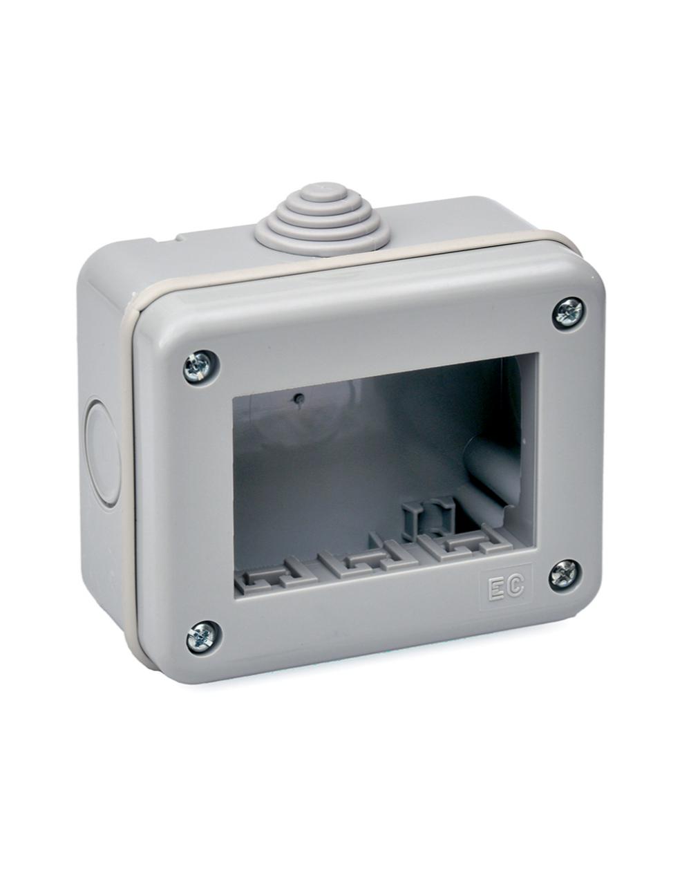 Επιτοίχιο κουτί της σειράς Elettrocanali My Life σε γκρι ματ χρώμα. Είναι από θερμοπλαστικό υλικό και η τοποθέτηση γίνεται με βιδωτό τρόπο. Είναι κατάλληλο για 3 στοιχεία. O βαθμός στεγανότητας είναι IP40.