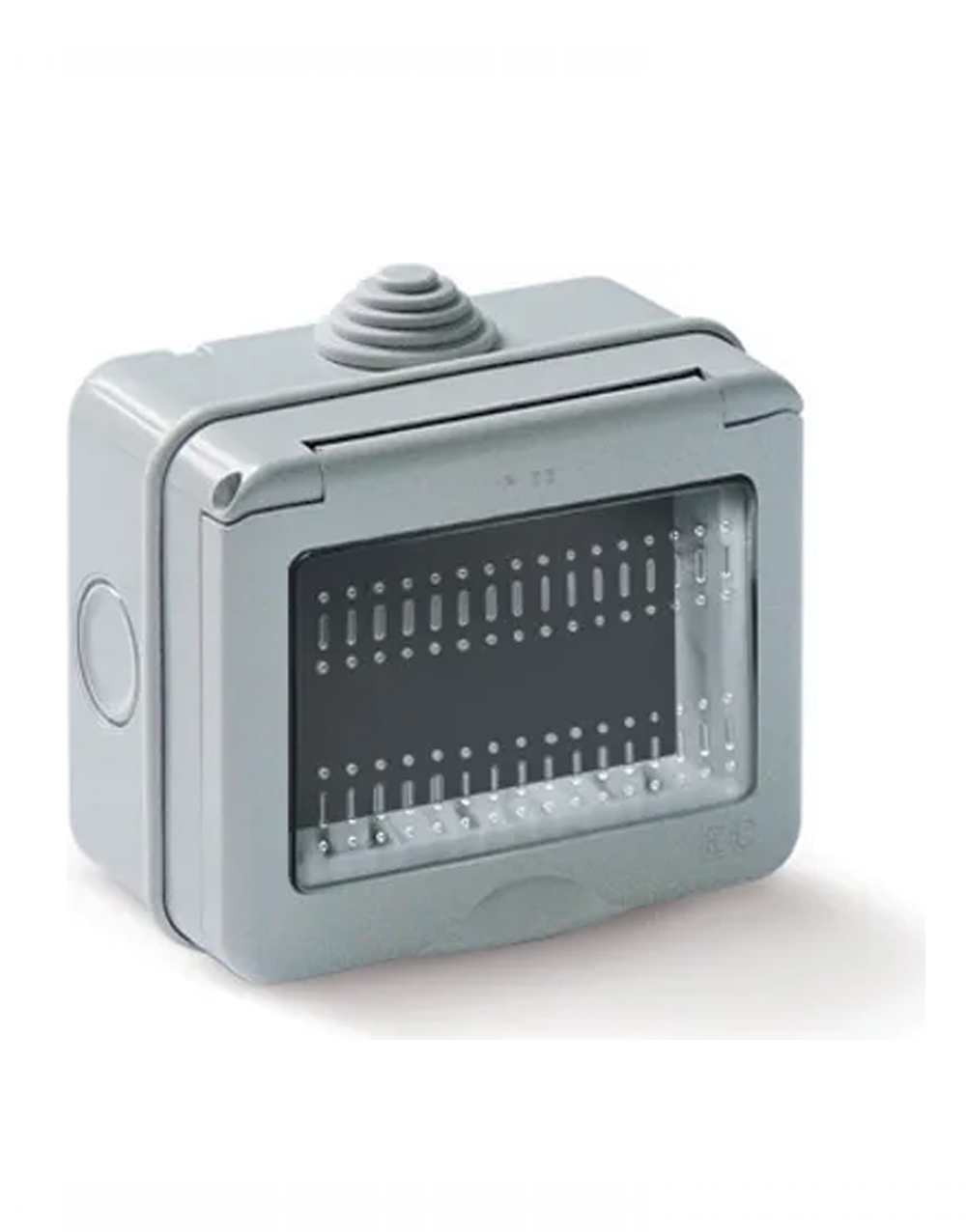 Επιτοίχιο κουτί με καπάκι της σειράς Elettrocanali My Life σε γκρι ματ χρώμα. Είναι από θερμοπλαστικό υλικό και η τοποθέτηση γίνεται με βιδωτό τρόπο. Είναι κατάλληλο για 3 στοιχεία. O βαθμός στεγανότητας είναι IP55.