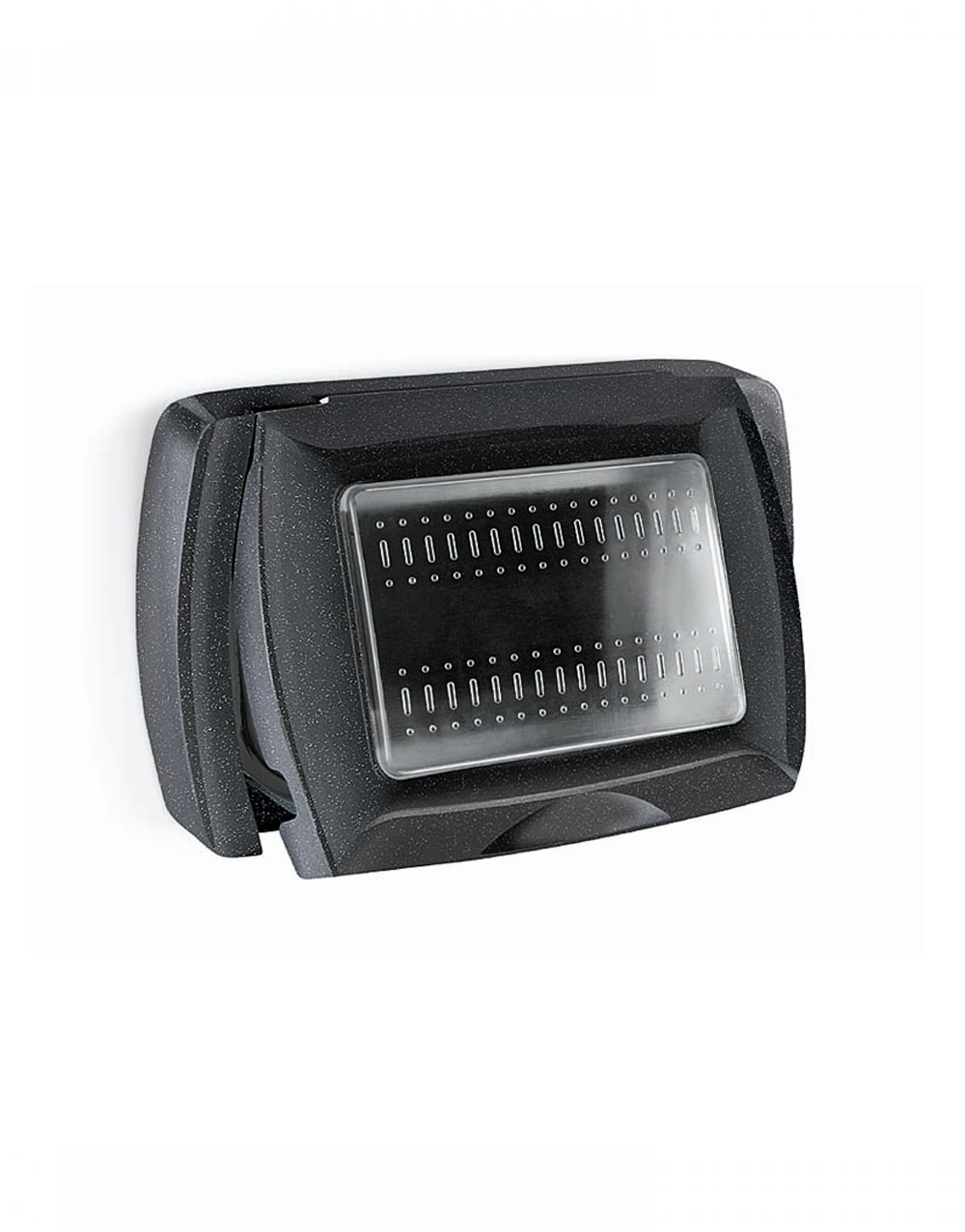 Επιτοίχια πρόσοψη με καπάκι αυτόνομη για χωνευτό κουτί της σειράς Elettrocanali My Life σε μαύρο ματ χρώμα. Είναι από θερμοπλαστικό υλικό και η τοποθέτηση γίνεται με βιδωτό τρόπο. Είναι κατάλληλο για 3 στοιχεία. O βαθμός στεγανότητας είναι IP55.