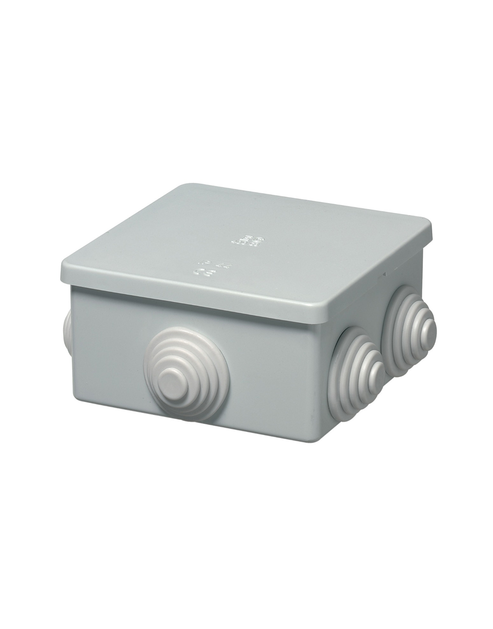 Κουτί διακλάδωσης με στυπιοθλήπτη και απευθείας είσοδο ή είσοδο με ευθή σωλήνα σε γκρι χρώμα από πολυαιθυλένιο. Ο βαθμός στεγανότητας είναι IP44 και το κουτί περιέχει 6 εισόδους. Η στερέωση γίνεται με βίδα εσωτερικά του κουτιού. Διαθέτει προστασία UV.