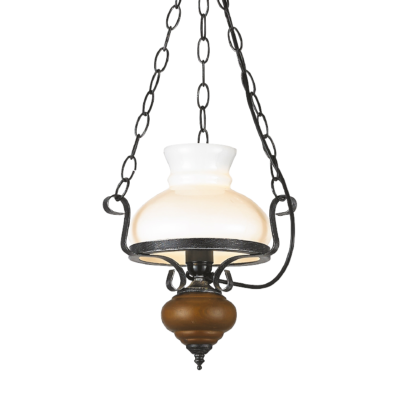 Κρεμαστό μεταλλικό φωτιστικό χρώματος μαύρο – ασημί διακοσμημένο με ξύλο και λευκό γυαλί.