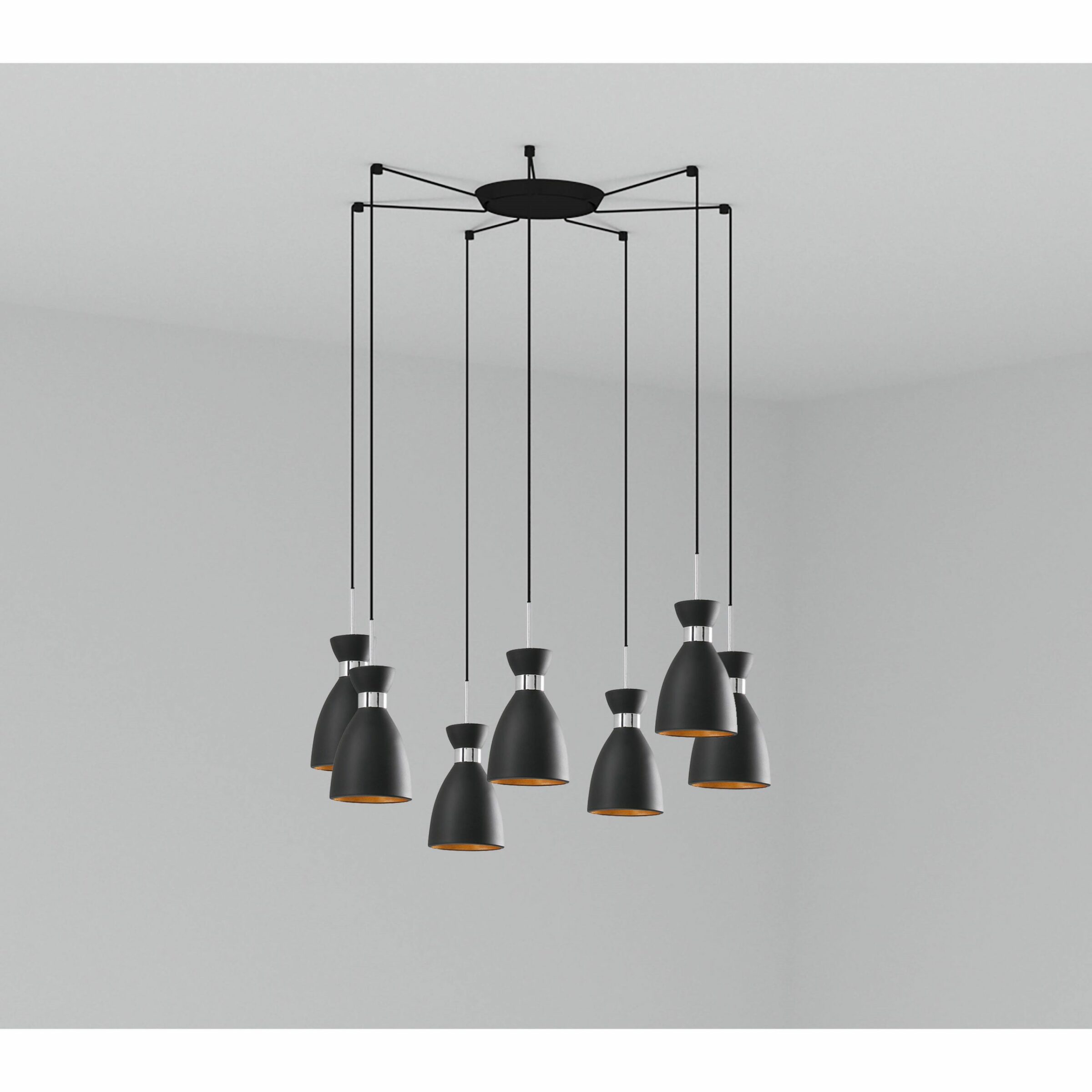 Το RETRO είναι μια σειρά σχεδιαστικών λαμπτήρων των Alex & Manel Lluscà εμπνευσμένων από τη δεκαετία του 60. Με αυτό το μαύρο και χάλκινο κρεμαστό φωτιστικό μπορείτε να φωτίσετε διαφορετικά το σπίτι σας. Με αυτήν τη σειρά θα έχετε έναν ρετρό αέρα για οικιακό φωτισμό. Έκδοση με τριαντάφυλλο πολλαπλών οροφών με 7 φώτα.