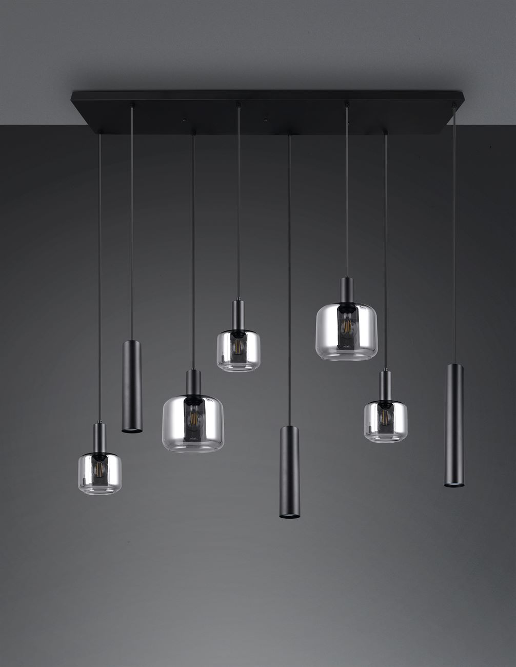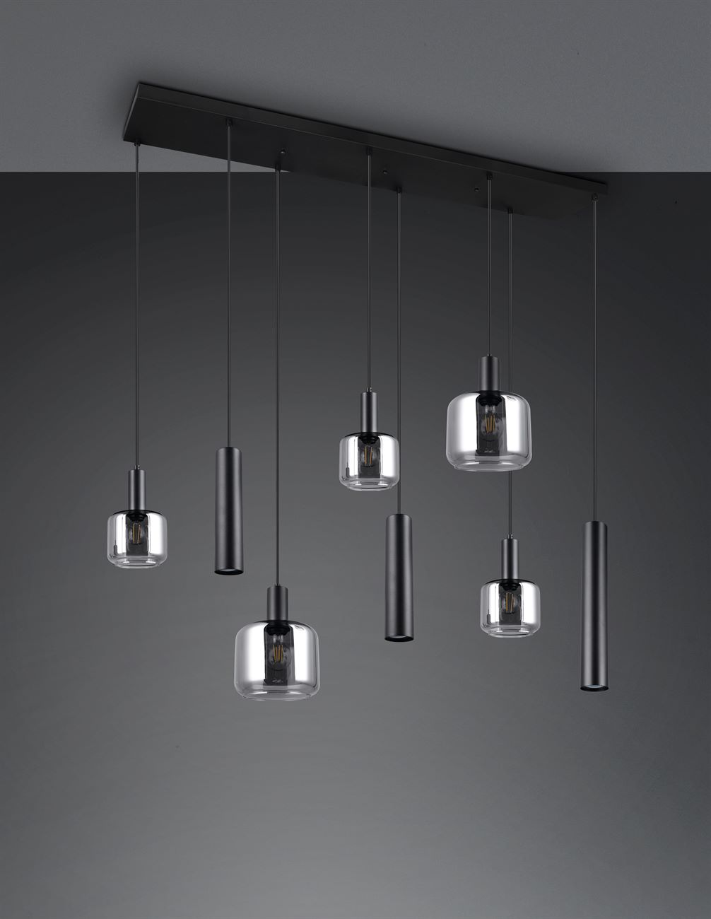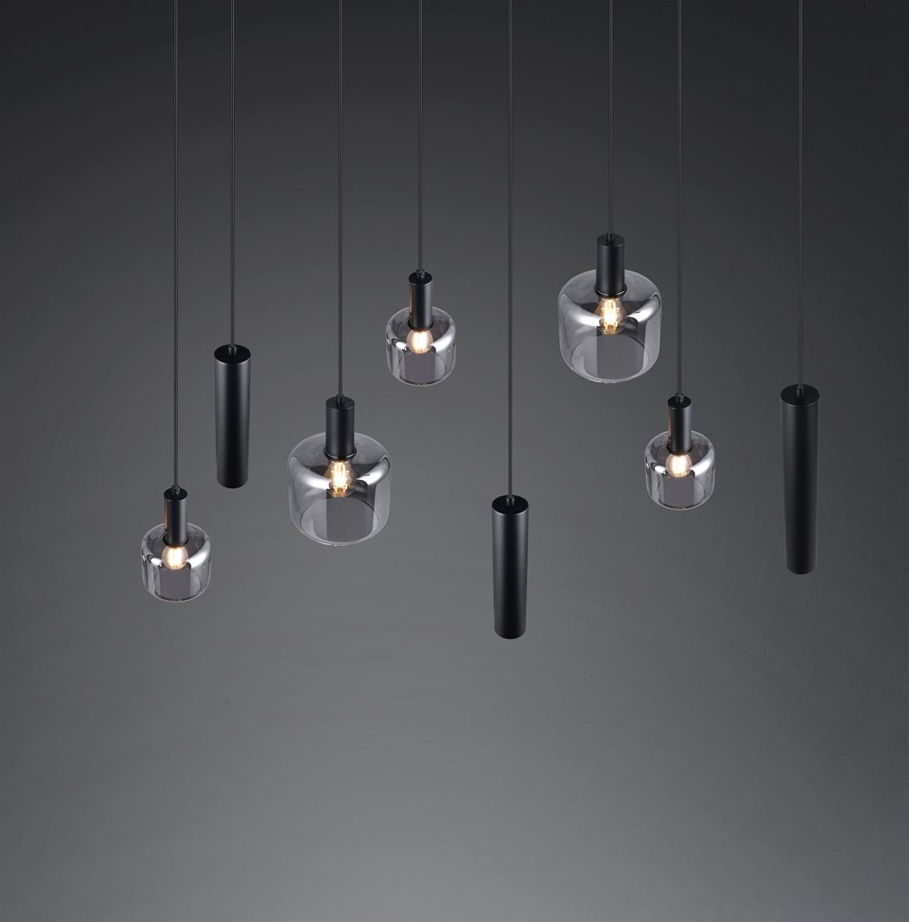 Το οκτάφωτο κρεμαστό φωτιστικό MATARO εντυπωσιάζει με τον μοντέρνο και κομψό σχεδιασμό του. Συνδυάζει τρία λεπτά μεταλλικά φωτιστικά με πέντε γυάλινα στοιχεία, τα οποία μαζί δημιουργούν μια ιδιαίτερη κατανομή φωτός και συναρπαστικές αντανακλάσεις στο δωμάτιο. Ο αρμονικός συνδυασμός αυτών των υλικών όχι μόνο βελτιώνει την εμφάνιση του σπιτιού σας, αλλά κάνει επίσης το φως ένα κομψό που τραβάει τα βλέμματα πάνω από κάθε τραπεζαρία. Το μέταλλο είναι μαύρο ματ, ενώ τα γυάλινα στοιχεία είναι επιχρωμιωμένα, δίνοντας στο φωτιστικό μια διακριτική λάμψη και ένα ελαφρύ εφέ καθρέφτη. Συνιστάται η χρήση πηγών φωτός LED για φωτισμό εξοικονόμησης ενέργειας. Αυτές είναι μια ιδανική εναλλακτική λύση σε σχέση με τις συμβατικές πηγές φωτός αλογόνου και προσφέρουν υψηλή ποιότητα φωτός και εξοικονόμηση ενέργειας έως και 80%. Με τις πηγές φωτός LED, επωφεληθείτε επίσης από τη μεγάλη διάρκεια ζωής και τη χαμηλή παραγωγή θερμότητας προστατεύοντας παράλληλα το περιβάλλον.