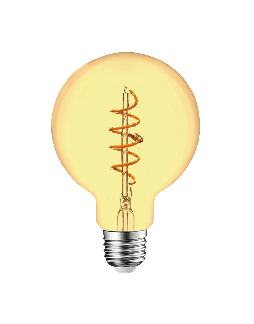 Λαμπτήρας LED Spiral Filament (με ρυθμιζόμενη ένταση-dimmer triac) G95 4W με ντουι E27, φωτεινότητα 300lm και θερμοκρασία χρώματος 2200Κ. Η τάση λειτουργίας της λάμπας είναι στα 220-240V & συχνότητα 50/60Hz.Η γωνία δέσμης φωτός είναι 360 μοίρες και στεγανοποίση IP20. Eγγύηση 2 έτη από την Universe.