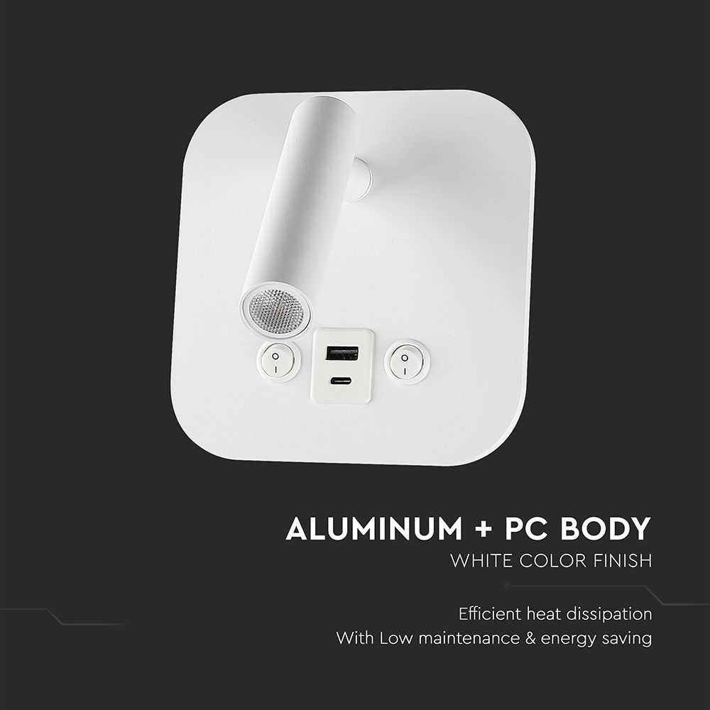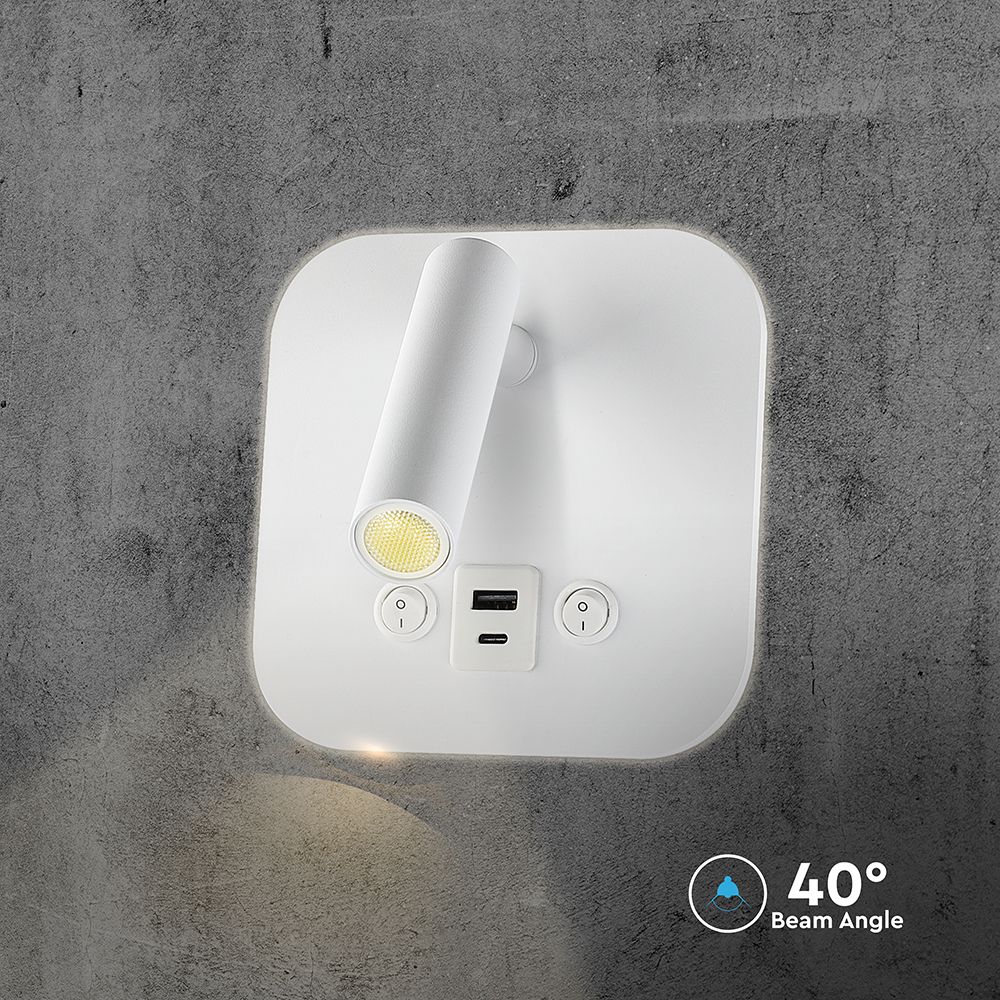 Φωτιστικό Ανάγνωσης Κρεβατιού Ξενοδοχείου V-TAC LED Σπότ & Οπίσθιο Φωτισμό Λευκό με Διακόπτη & Θύρες Φόρτισης USB 830lm 3000K – 240026