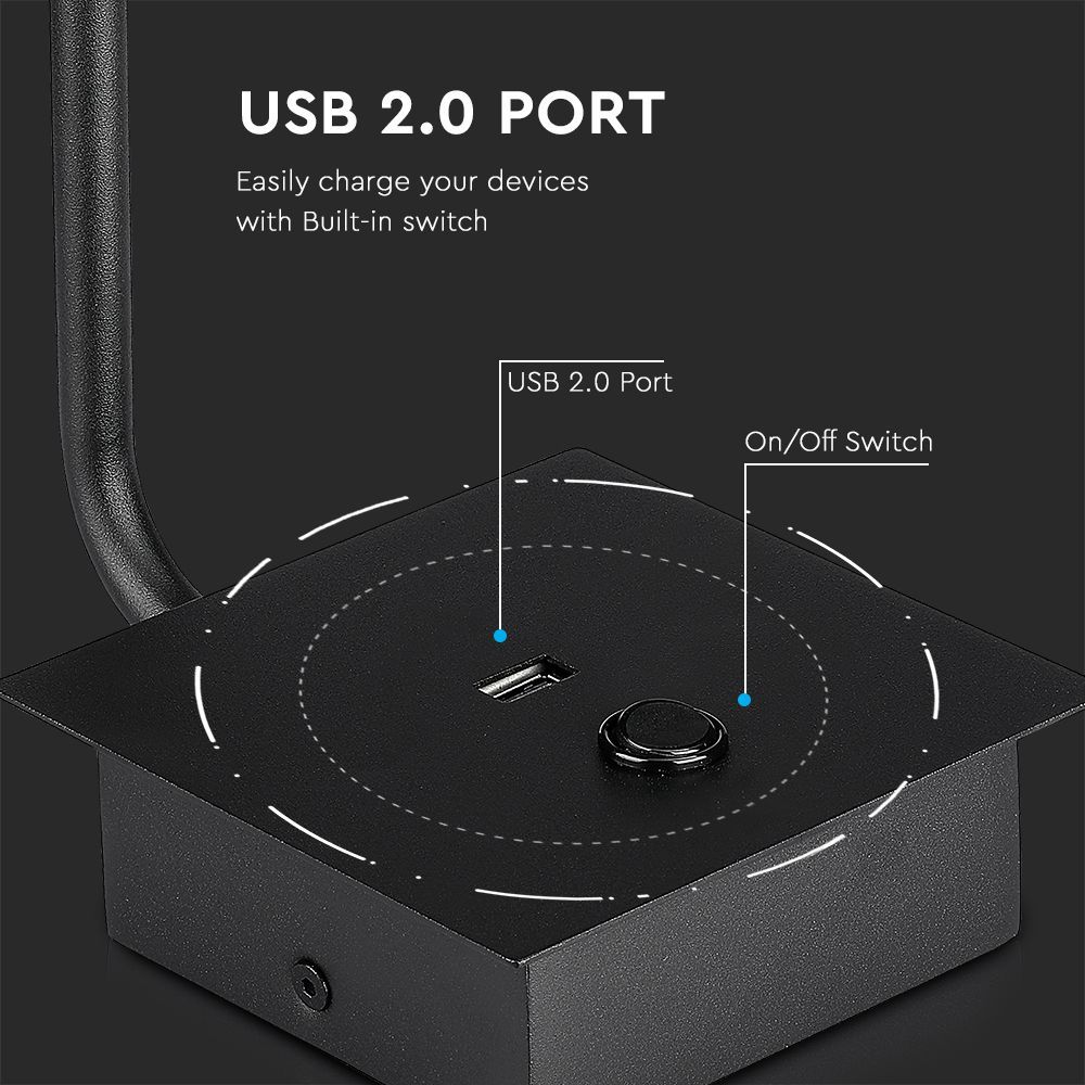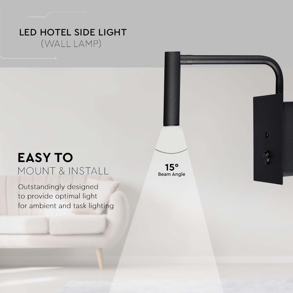 LED επιτοίχιο φωτιστικό κομοδίνου 3W σε μαύρο σώμα και θύρα USB για ξενοδοχεία V-TAC – 211487