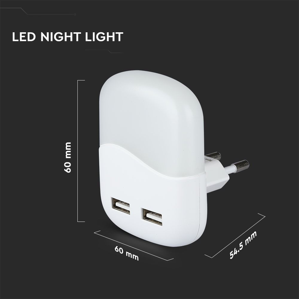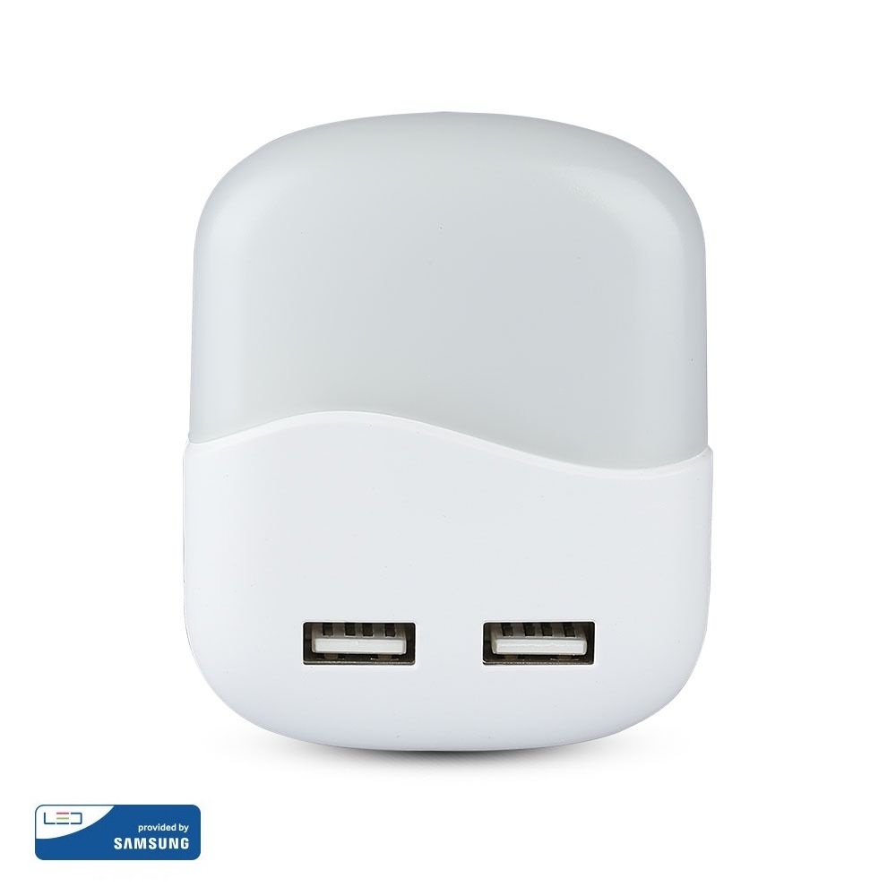 LED Φωτιστικό Νυκτός Τετράγωνο Λευκό με Αισθητήρα Νύχτας-Μέρας με 2xUSB Θύρες Φόρτισης 0.5W V-TAC PRO Samsung Chip 10lm Θερμό Λευκό 3000K – 507
