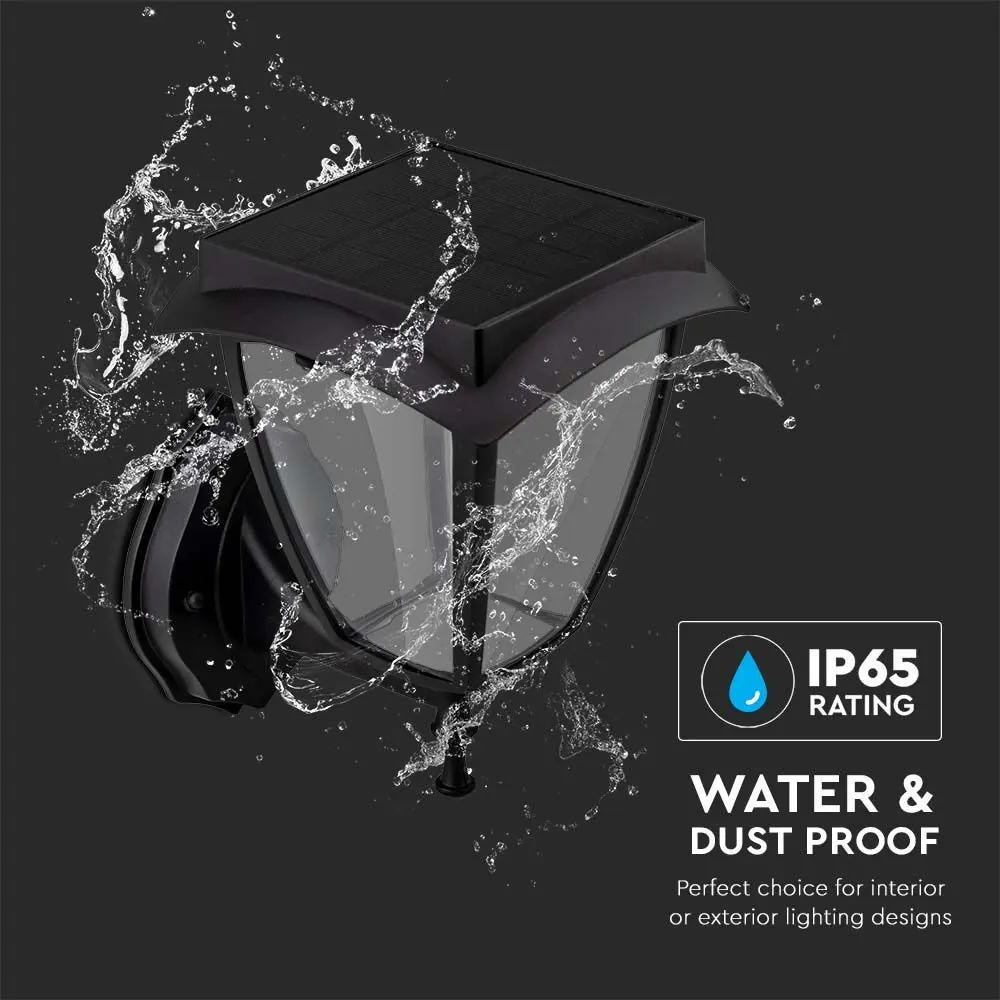 Λάμπα εξωτερικού χώρου 2W V-Tac VT-982 αλουμινίου μαύρου φωτός με τεχνολογία Samsung SMD LED, βαθμό προστασίας IP65, αισθητήρα λυκόφως και ηλιακό πάνελ. Περιλαμβάνεται κιτ με 2 βίδες στερέωσης για τοποθέτηση σε τοίχο.