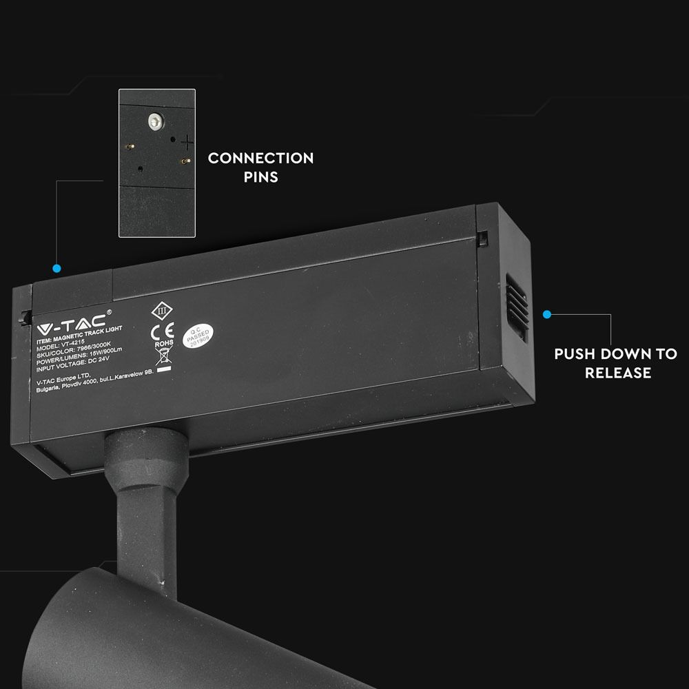 LED Μαγνητικό Φωτιστικό Ράγας 15W V-TAC Μαύρο CRI 90 24V 36° Φυσικό 4000K – 7967