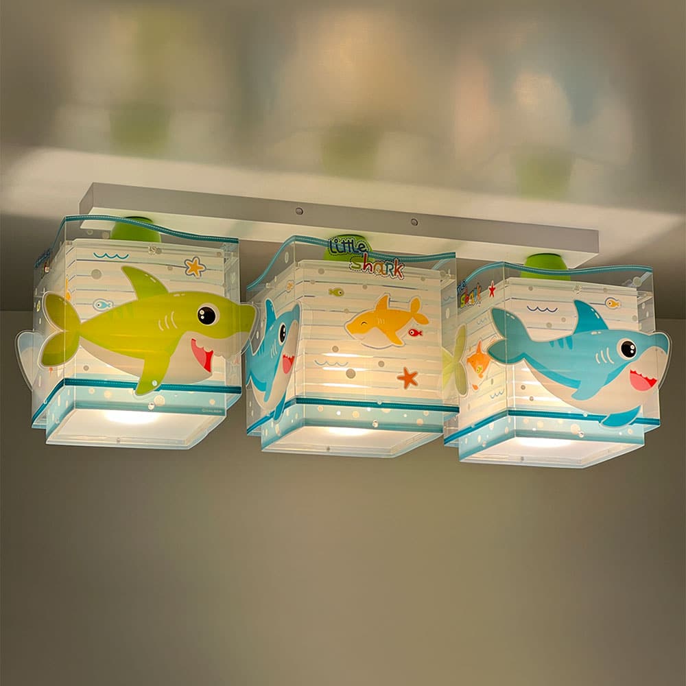 Τρίφωτο παιδικό φωτιστικό οροφής σε διάταξη ράγας κατάλληλο για γενικό φωτισμό και θέμα τους καρχαρίες. Κατασκευασμένο με καπέλα διπλού τοιχώματος από άκαυστο λεπτό πολυπροπυλένιο και φωσφορίζοντα στο σκοτάδι εξωτερικά μέρη. Παρέχεται διαχυτής φωτός για τις μικρότερες ηλικίες προσφέροντας ομοιόμορφο φωτισμό αλλά και προστασία στα μάτια. Κιτ ανάρτησης σε σχήμα ράγας και εύκολο τρόπο στήριξης. Τύπος ντουί E27 με θέσεις για τρεις λαμπτήρες LED για άπλετο φως στο δωμάτιο. Κατασκευασμένο εξ ολοκλήρου στην Ευρώπη το Little Shark τρίφωτο οροφής ράγας, συμπληρώνει τα υπόλοιπα παιδικά φωτιστικά της συλλογής κομοδίνου, απλίκα ή νυκτός.