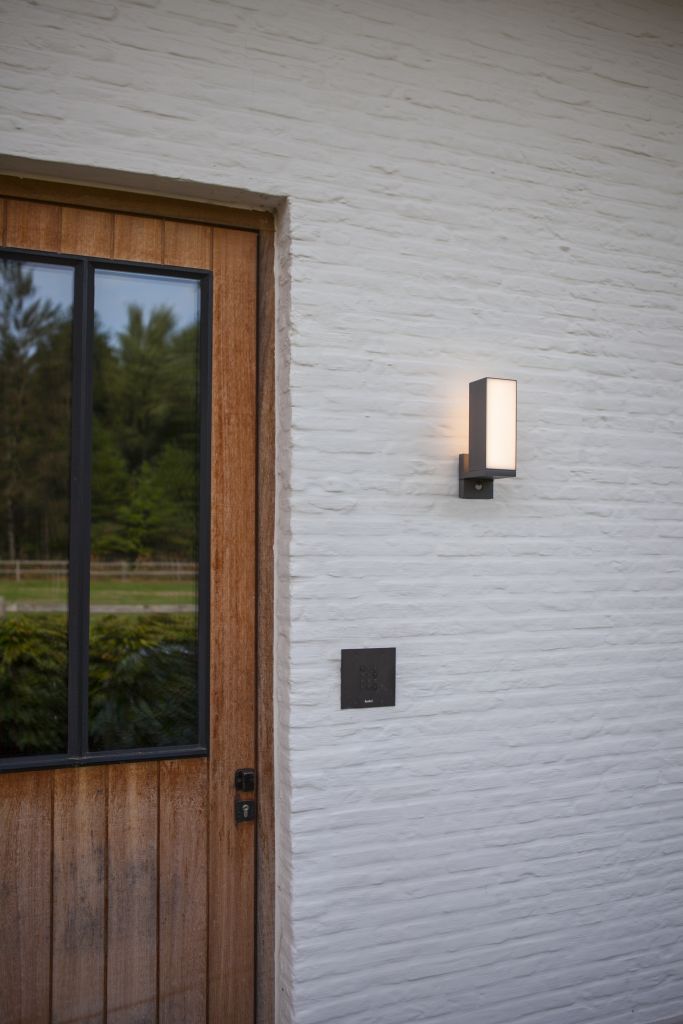 Μοντέρνο και ευέλικτο εξωτερικό φωτιστικό τοίχου με ενσωματωμένη μονάδα LED. Η κεφαλή φωτός με διπλό διαχύτη μπορεί να περιστραφεί κατά 90° και είναι εξοπλισμένη με αισθητήρα κίνησης και ισχυρή δέσμη φωτός 1000 lumen.