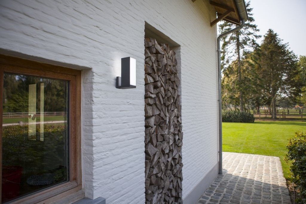 Ορθογώνιο, μοντέρνο και ευέλικτο φωτιστικό τοίχου εξωτερικού χώρου με ενσωματωμένη συνδεδεμένη μονάδα LED κατάλληλη για κάθετη και οριζόντια τοποθέτηση. Η κεφαλή φωτός με διπλό διαχύτη μπορεί να περιστραφεί κατά 90°. Διατίθεται και με αισθητήρα κίνησης.