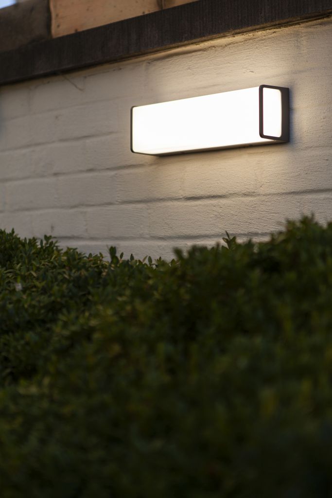 Αυτό το φωτιστικό τοίχου LED σε γκρι ανθρακί τοποθετείται σε μια ορθογώνια βάση από ανθεκτικό χυτό αλουμίνιο. Ο κομψός σχεδιασμός εκπέμπει ένα ισχυρό δροσερό λευκό φως 2200 lumen.