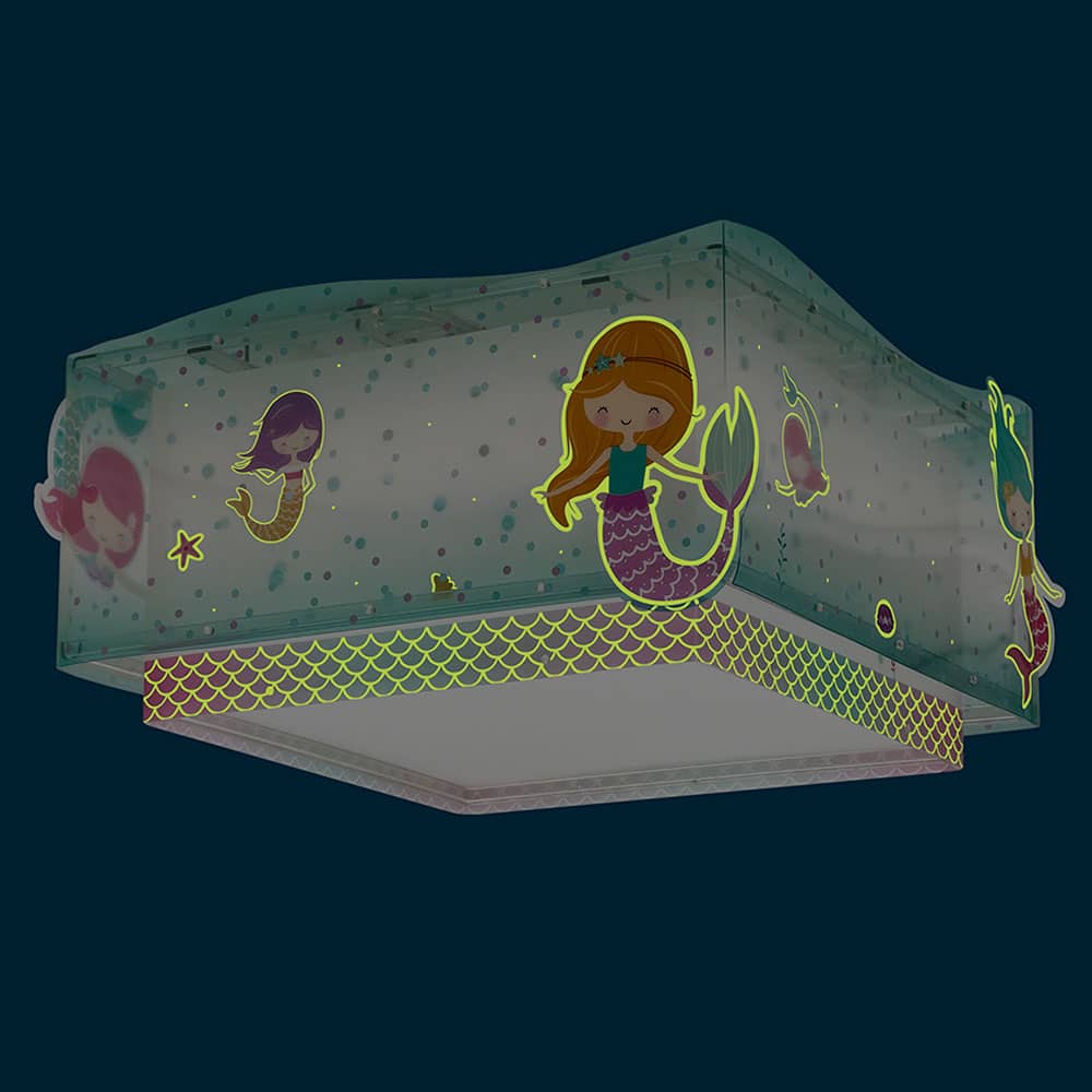 Παιδικό φωτιστικό οροφής τύπου πλαφονιέρα κατάλληλο για γενικό φωτισμό και όλες τις δραστηριότητες των παιδιών. Είναι διπλού τοιχώματος από άκαυστο λεπτό πολυπροπυλένιο και φωσφορίζοντα στο σκοτάδι εξωτερικά μέρη. Τοποθετείται εύκολα και γρήγορα και είναι εφοδιασμένο με δύο θέσεις λαμπτήρων LED για πραγματικά άπλετο φως στο δωμάτιο. Παρέχεται διαχυτής φωτός για τις μικρότερες ηλικίες που προσφέρει ομοιόμορφο φωτισμό αλλά και προστασία. Κατασκευασμένο εξ ολοκλήρου στην Ευρώπη το Mermaids πλαφονιέρα οροφής, συμπληρώνει τα υπόλοιπα παιδικά φωτιστικά της συλλογής κομοδίνου, απλίκα ή νυκτός.