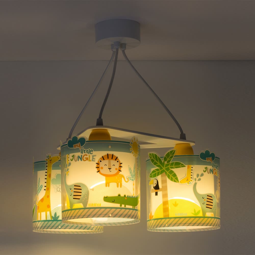 Μοντέρνα, τριγωνική κατασκευή με τρία φωτεινά σώματα σε κάθε γωνία και ανάλογες θέσεις λαμπτήρων. Κατασκευασμένο με διπλά τοιχώματα και φωσφορίζοντα μέρη στο σκοτάδι προσφέρει άπλετο φως, διασκεδαστικό χαρακτήρα και χρώμα σε κάθε σημείο του παιδικού δωματίου. Απόλυτα ασφαλές ώστε τα παιδιά να μπορούν να μελετήσουν, να παίξουν και να κοιμηθούν παρέα με το αγαπημένο τους θέμα. Το My Little Jungle κρεμαστό τρίφωτο φωτιστικό οροφής κατασκευάζεται εξ ολοκλήρου στην Ευρώπη και συμπληρώνει τα υπόλοιπα φωτιστικά της συλλογής.