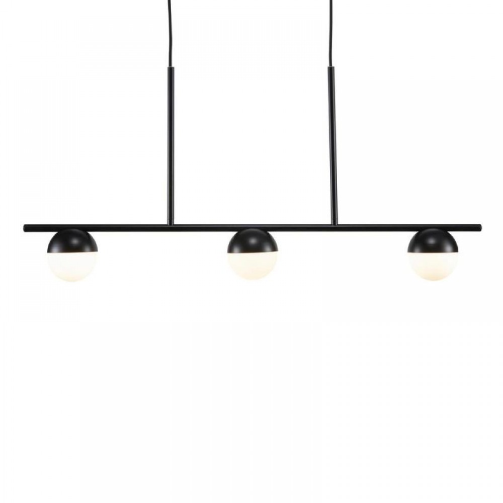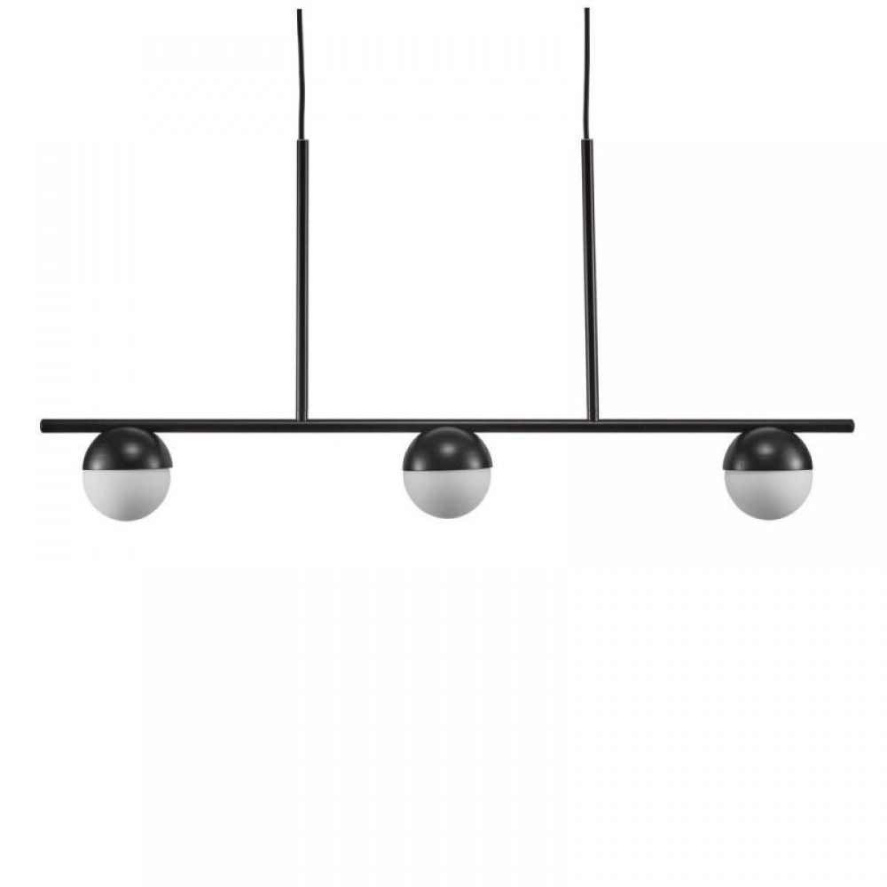 Κρεμαστό φωτιστικό οροφής τρίφωτο σε διάταξη ράγας από μέταλλο σε χρώμα μαύρο και λευκό οπάλ γυαλί. Διαθέτει καλώδιο σε χρώμα μαύρο και μήκος 200εκ. Διαθέτει τρείς λαμπτήρες LED G9 με ισχύ έως 12W.