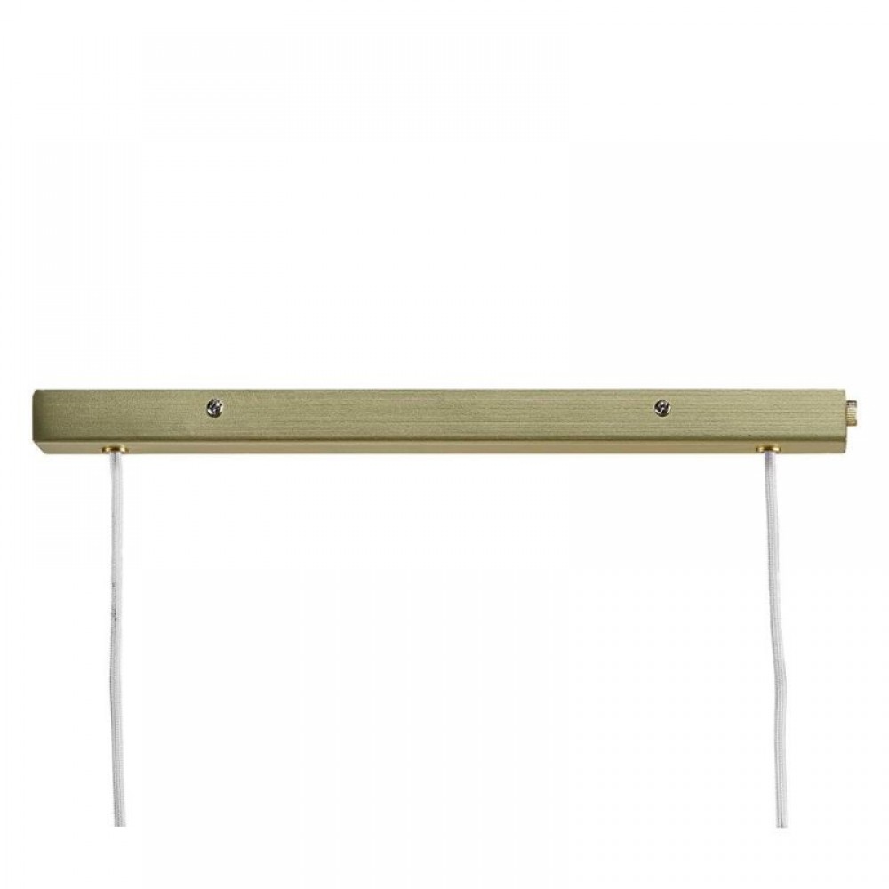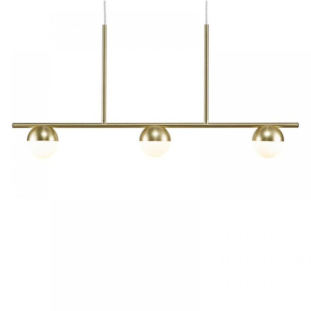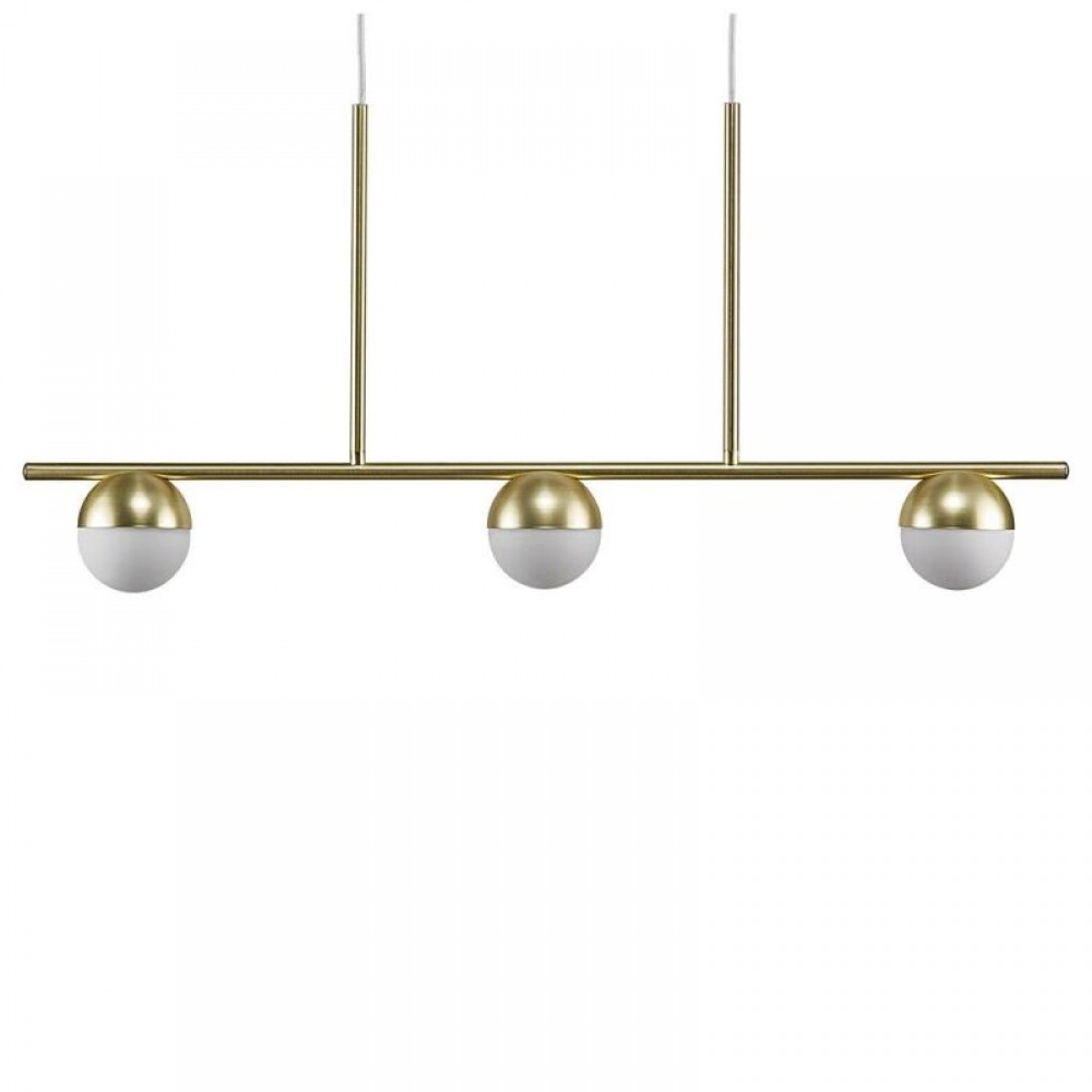 Κρεμαστό φωτιστικό οροφής τρίφωτο σε διάταξη ράγας από μέταλλο στο χρώμα του ορείχαλκου και λευκό οπάλ γυαλί. Διαθέτει καλώδιο σε χρώμα λευκό και μήκος 200εκ. Διαθέτει τρείς λαμπτήρες LED G9 με ισχύ έως 12W.