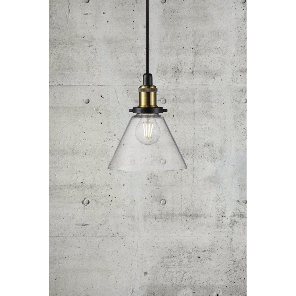 Κρεμαστό φωτιστικό οροφής μονόφωτο από διάφανο γυαλί. Διαθέτει καλώδιο σε χρώμα μαύρο και μήκος 300εκ. Δέχεται ένα λαμπτήρα LED Ε27 με ισχύ έως 15W.