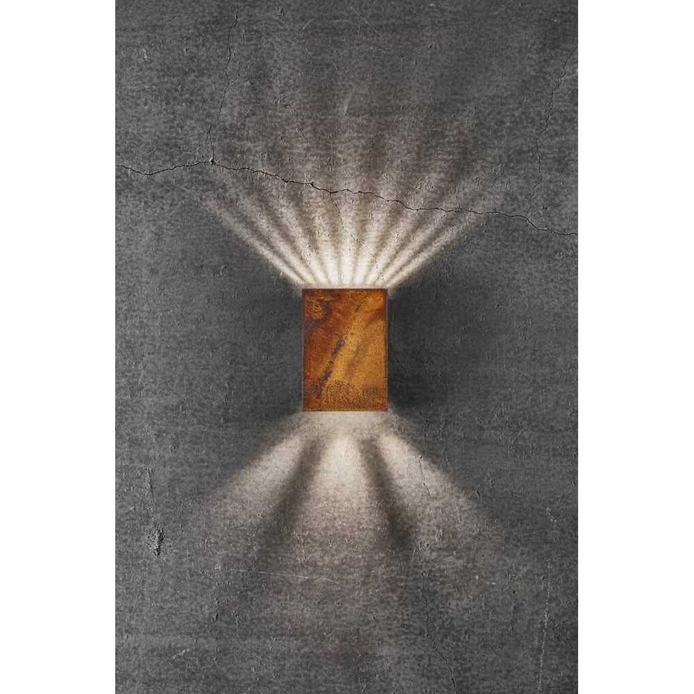 Επίτοιχο φωτιστικό απλίκα δίφωτο εξωτερικού χώρου από μέταλλο στο χρώμα της σκουριάς με διπλή κατεύθυνση φωτισμού πάνω-κάτω και τέσσερις επιλογές για να διαμορφώσετε το προσωπικό σας στυλ. Διαθέτει ενσωματωμένο LED με ισχύ 3,75W και απόδοση 200 Lumen σε θερμό λευκό χρώμα 3000Κ.