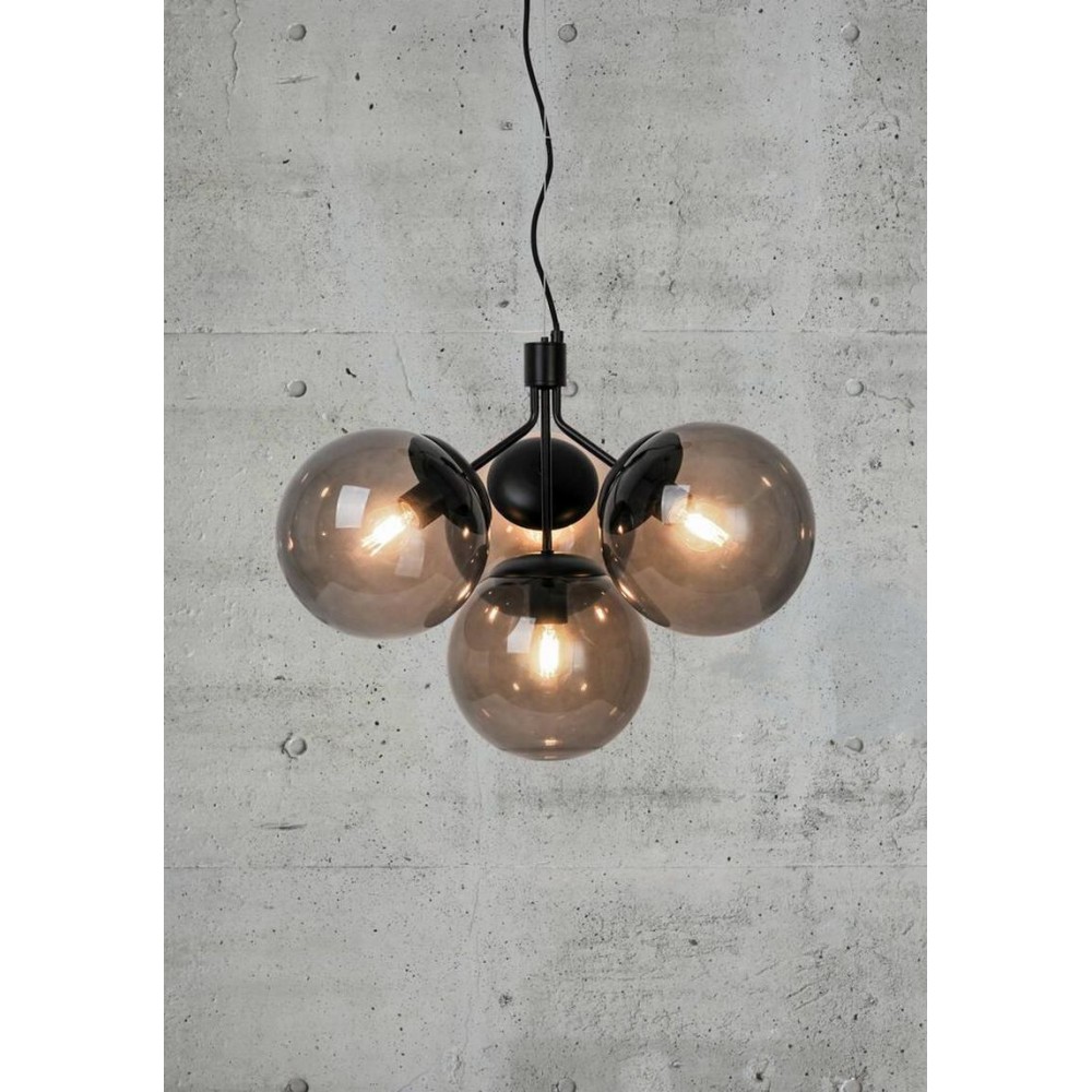 Κρεμαστό φωτιστικό οροφής τετράφωτο από φιμέ γυαλί και βάση στήριξης μεταλλική σε χρώμα μαύρο. Διαθέτει καλώδιο μαύρο και μήκος 200εκ. Δέχεται τέσσερις λαμπτήρες LED Ε27 με ισχύ έως 15W.